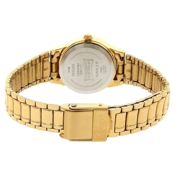 Simple yet stylish, this women's analog watch from Sonata will be a perfect pick for you. Its stainless steel bracelet flaunts a golden hue that accentuates the look of the watch. The golden round dial is encased in a 28.22 mm case. It exudes plain three hands and a crown for time adjustment. Furthermore, it is completed with a hook buckle clasp to ensure a secure fit on the wrist.