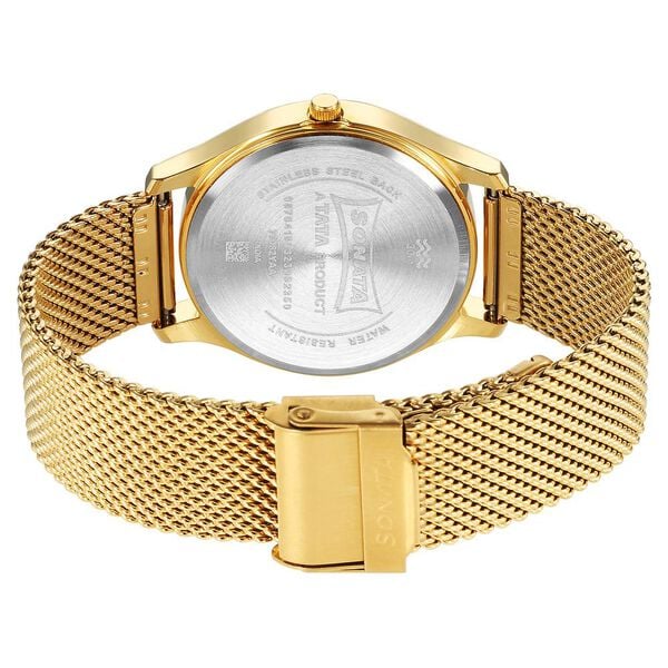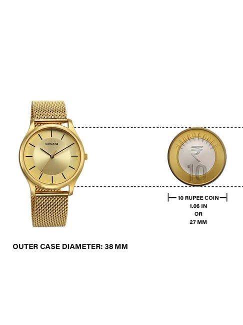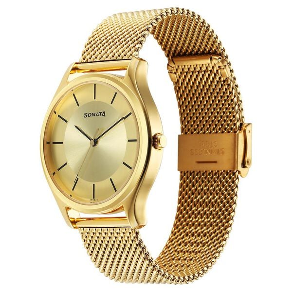 Impress everyone around you by donning this men's analog watch from Sonata. Encased in a 38 mm case, the gold round dial features plain 3-hand functionality and quartz movement on the watch. The stainless steel bracelet comes in a gold hue that further elevates the look of the watch. Besides, it is water resistant up to 30 m and is completed with a hook buckle to ensure a secure fit on the wrist.