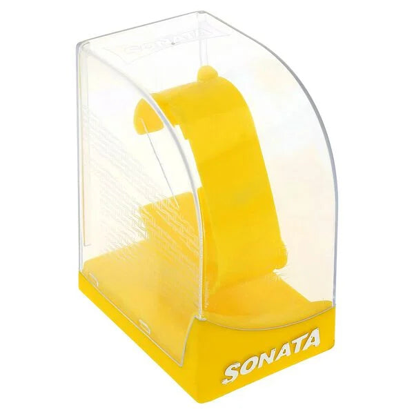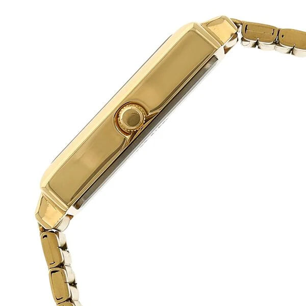 This analog watch for men features a rectangular, white dial enclosed in a golden, Metal case with a crown that lets you adjust the time. The dial has plain three hands and slanted lines marking the five minute intervals. The golden strap is made of stainless steel. Equipped with 3 ATM water resistance feature, the timepiece is user-friendly. It comes with a 12 month warranty.