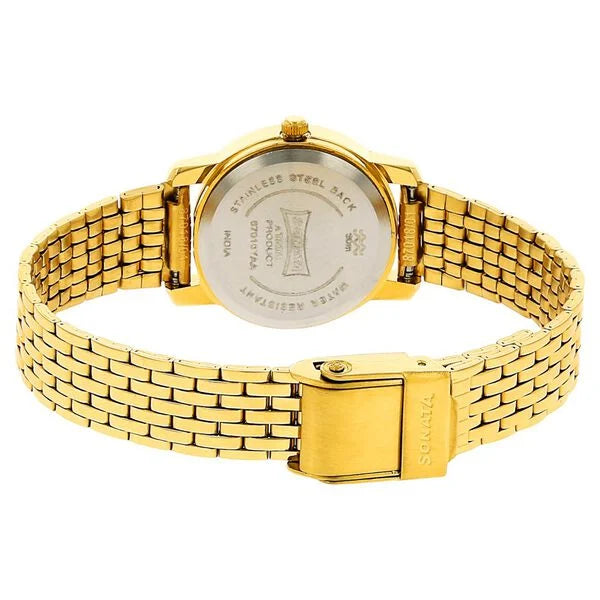 Showcase your penchant for stylish accessories with this analog watch from Sonata. It ccomes with water resistance, buckle mechanism and a warranty of 1 year. A round Metal case underlines its overall glamorous appeal