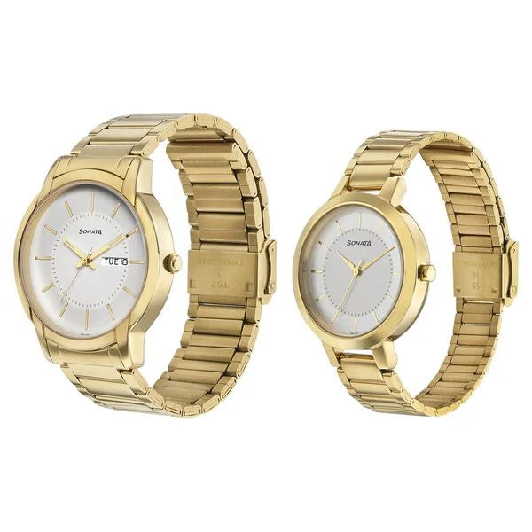 Reflecting the dynamism of modern lifestyles, this pair of analog watches from the Pairs 2.0 collection by Sonata will be a great pick for a Couples. Secured by a mineral glass, the white round dials exhibit plain three hands, bold stick indices at five-minute intervals and a crown for time adjustment. The stainless steel straps come in a golden hue that further elevates the look of the timekeepers.