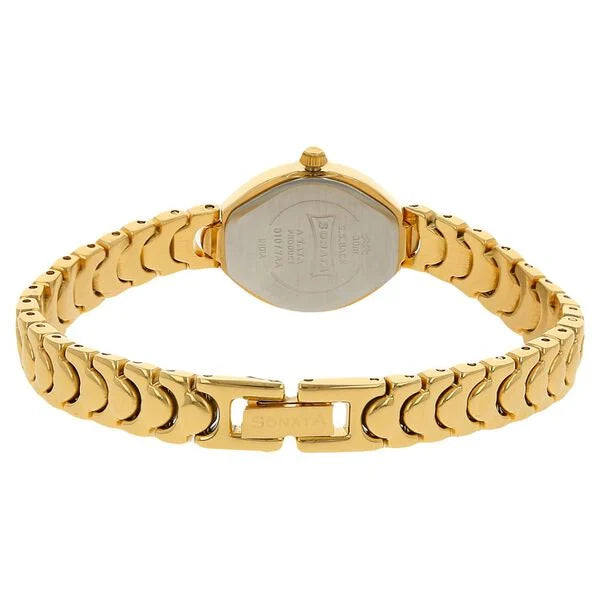 This analog watch for women contains an oval dial, which is white and encased in a Metal case. Additionally, a crown lets you adjust the time. With three plain hands and regular markings on the dial, this timepiece is user-friendly. Made of stainless steel, its strap is secured by a jewellery clasp.