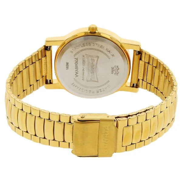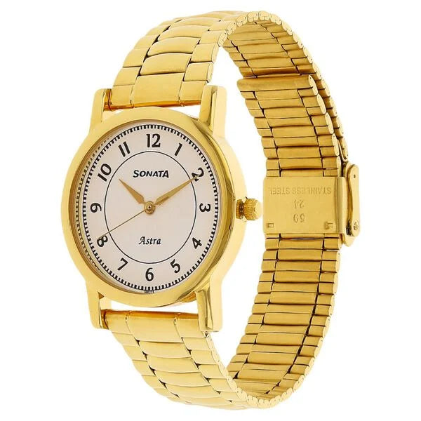 Exhibit a masculine charm donning this men's analog watch from Sonata's Astra collection. Safeguarded by a mineral glass, the white round dial enclosed in a 32.7 mm case flaunts plain three hands directional on a quartz movement, numeral markings at five-minute intervals and a crown for time adjustment. Its golden stainless steel strap completed with a hook buckle clasp provides a proper fit on the wrist. Team this water-resistant timepiece with a pair of trousers and a sky blue shirt to look handsome.