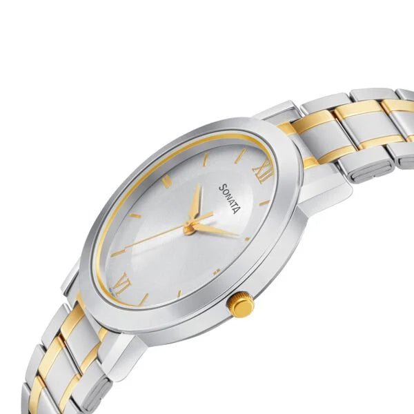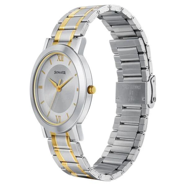"Sonata Quartz Analog Watch for Men - NS77108BM02W features a sleek silver dial paired with a durable stainless steel strap. It includes a convenient date display, blending style and functionality for everyday elegance."