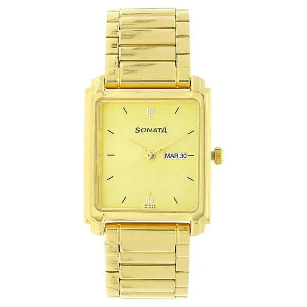 This analog watch for men has a rectangular, champagne dial with three plain hands, markings at the five minute intervals and a day and date display at the 3rd hour interval. A crown on the case lets you adjust the time. Made of sheet metal, its gold strap is fitted with a special three piece sliding clasp.