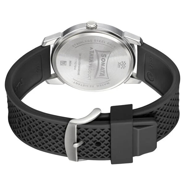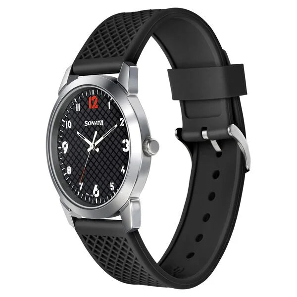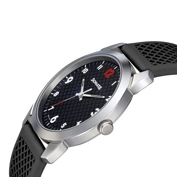 Sonata Smart Plaid Quartz Analog Black Dial TPU Strap Watch for Men np77107sp02w