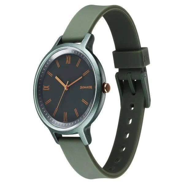 Get hold of this stylish women's analog watch by Sonata and enhance your casual timepiece collection. The leather strap showcases a green hue that uplifts the look of the watch. Functional on a quartz movement and protected by a sapphire glass, the black round dial housed in a 47.78 mm case. It displays plain three hands. Besides, it is completed with a buckle clasp to ensure a secure fit on the wrist.