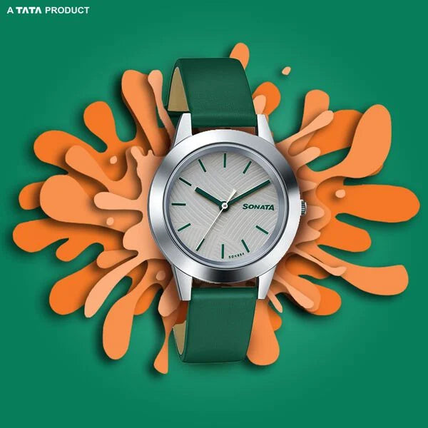 Add a refreshing touch of elegance to your everyday style with the Sonata Splash Watch. This timepiece features a white textured dial with sleek green hands, a contrasting white seconds hand, and bold green stick markers. The green leather strap complements the dial, creating a trendy and youthful appeal, while the polished silver case ensures durability and sophistication. Perfect for work, casual wear, or gifting, this watch blends modern minimalism with vibrant design.