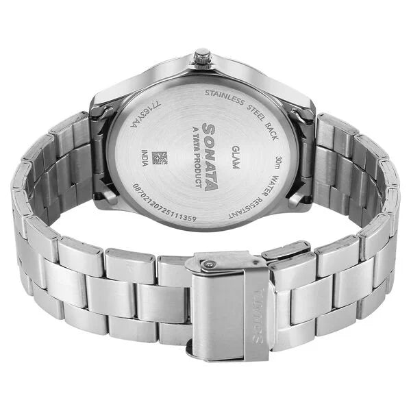 Experience perfection, one second at a time with this analog watch from Sonata. Encased in a 43 mm case, the white round-shaped dial is covered with mineral-colorless watch glass and features plain 3-hand functionality for time adjustment. The watch works on a quartz movement. The stainless steel bracelet comes in a gold hue that further elevates the look of the watch. Besides, it is water resistant up to 30 m and is completed with a hook buckle to ensure a secure fit on the wrist.