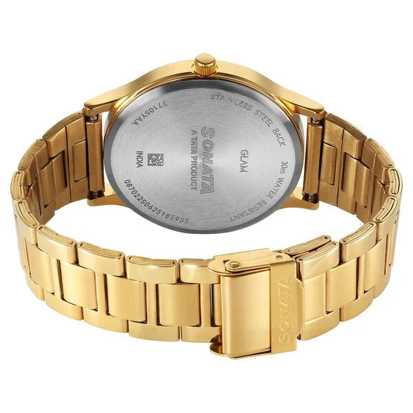 Experience perfection, one second at a time with this analog watch from Sonata. Encased in a 42 mm case, the white round-shaped dial is covered with mineral-colorless watch glass and features plain 3-hand functionality for time adjustment. The watch works on a quartz movement. The stainless steel bracelet comes in a gold hue that further elevates the look of the watch. Besides, it is water resistant up to 30 m and is completed with a hook buckle to ensure a secure fit on the wrist.