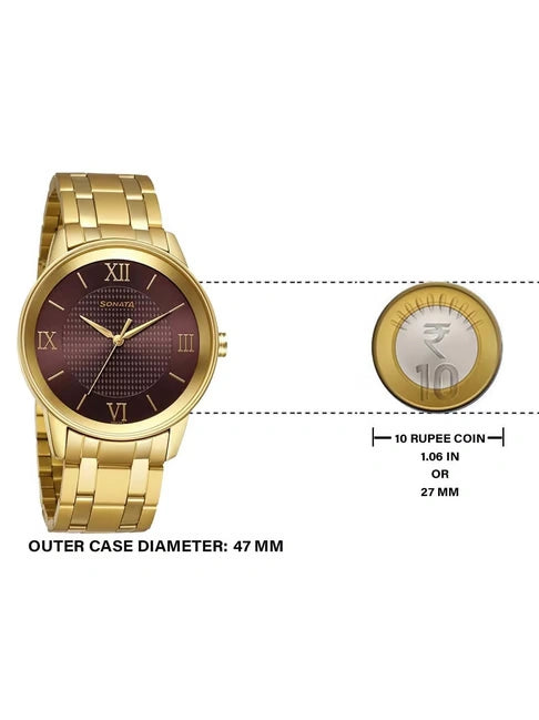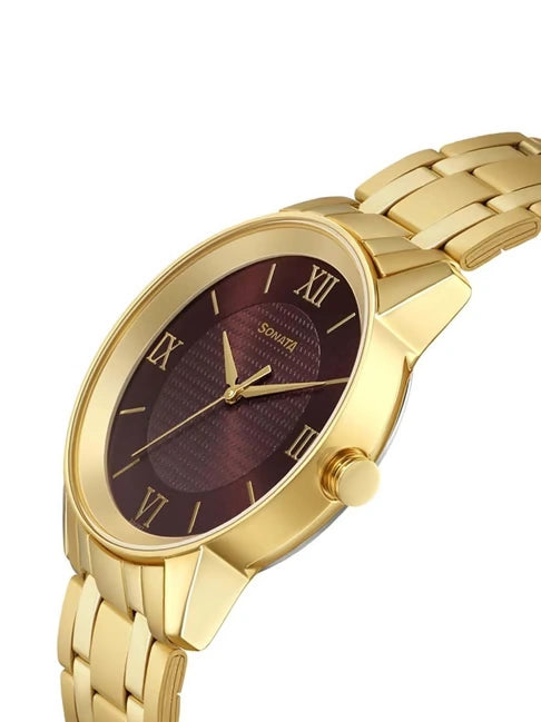 Take your look up several notches with this men's analog watch from the Utsav collection by Sonata. The brown round dial is nestled in a 47 mm case. It exhibits plain three hands and a crown for time adjustment. The stainless steel bracelet vaunts a golden hue that enhances the look of the watch. Furthermore, it is completed with a hook buckle clasp to ensure a secure fit on the wrist. This water-resistant watch will be your timeless possession.