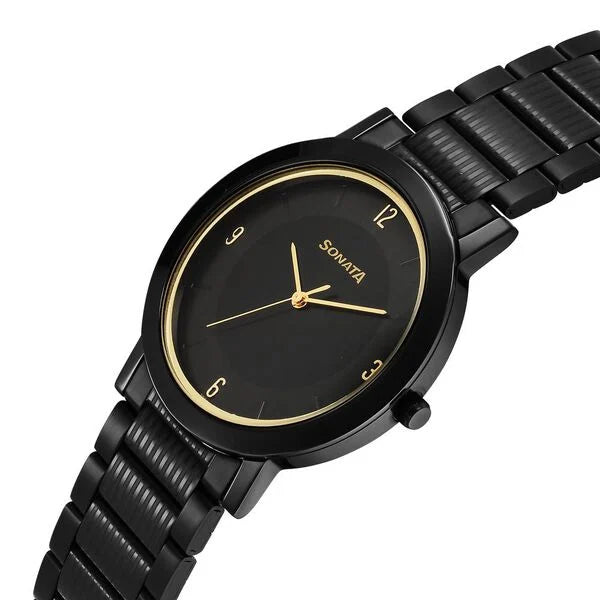 Compel the onlookers to cast a glance of appreciation as you wear this men's analog watch by Sonata. Secured by a sapphire glass, the black round dial is functional on a quartz movement. It exhibits plain three hands. The stainless steel strap comes in a black hue that further elevates the look of the watch. Moreover, it is fitted with a hook buckle clasp that ensures a secure fit on the wrist.