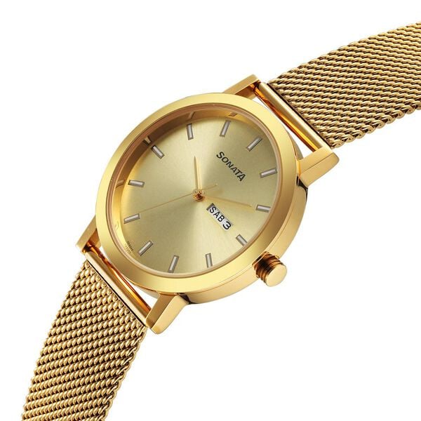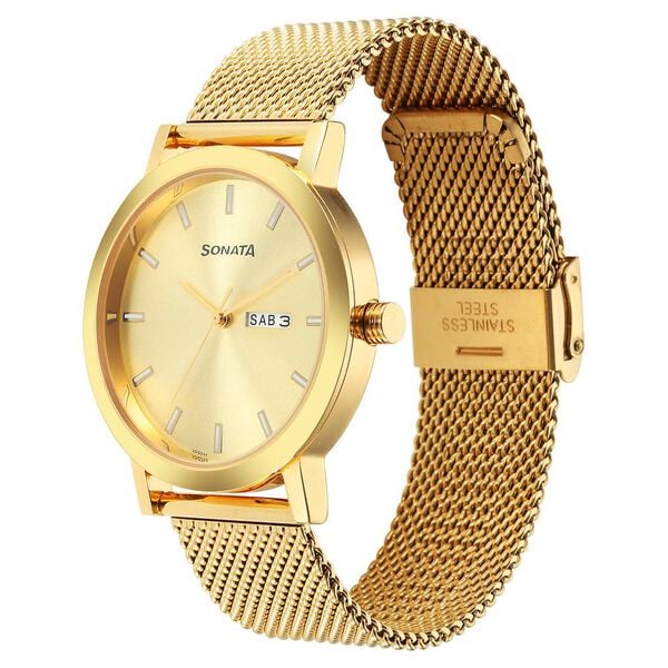 Vaunting a masculine design, this men's analog watch by Sonata is a must-have timepiece. Operated by a quartz movement and safeguarded by a sapphire glass, the gold round dial is encased in a 49.1 mm case. It features plain three hands. The stainless steel strap flaunts a gold hue that accentuates the look of the watch. Moreover, it is fitted with a hook buckle clasp to ensure a secure fit on the wrist.