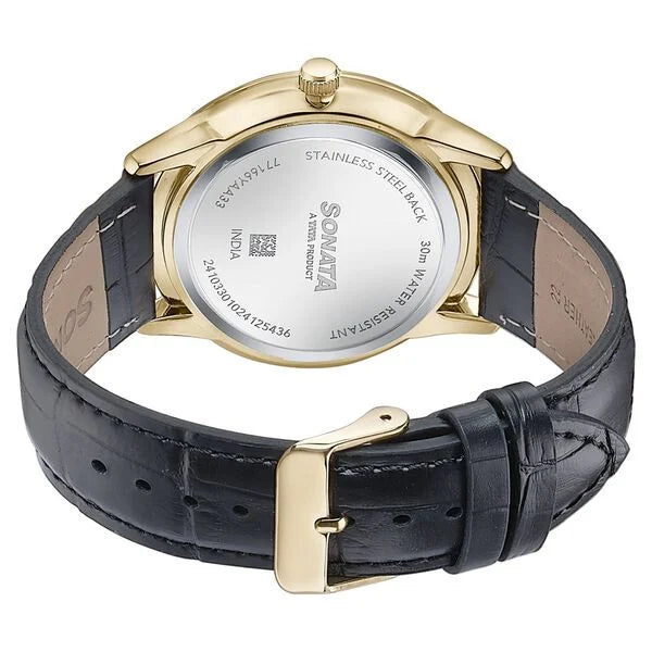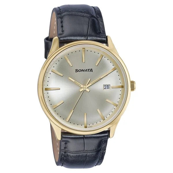 Sonata Wedding Edit Quartz Analog with Date Golden Dial Leather Strap Watch For Men 77166yl01