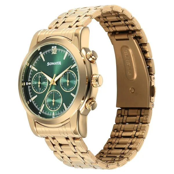 Crafted with precision, this analog watch from the Festive Collection collection by Sonata is a must-have in every men's watch collection. Secured by a mineral glass, the green round dial is housed in a 49.8 mm case. It exhibits multifunction. The stainless steel strap exudes a gold hue that accentuates the look of the watch. Moreover, it is equipped with a push-button clasp to ensure a secure fit on the wrist.