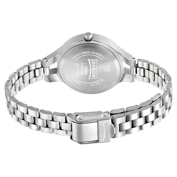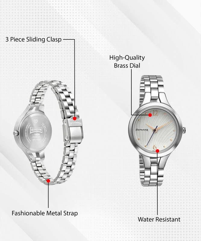 Elevate your professional attire with this sophisticated timepiece, meticulously designed for the contemporary woman. Its pristine white dial features subtle, elegant textures and refined markers, offering a clean and distinguished display for time. Complementing this, the sleek silver stainless steel strap provides a comfortable, secure fit and exudes a polished, contemporary allure suitable for any corporate setting. A perfect blend of form and function, this watch seamlessly enhances your professional look with Its subtle elegance.