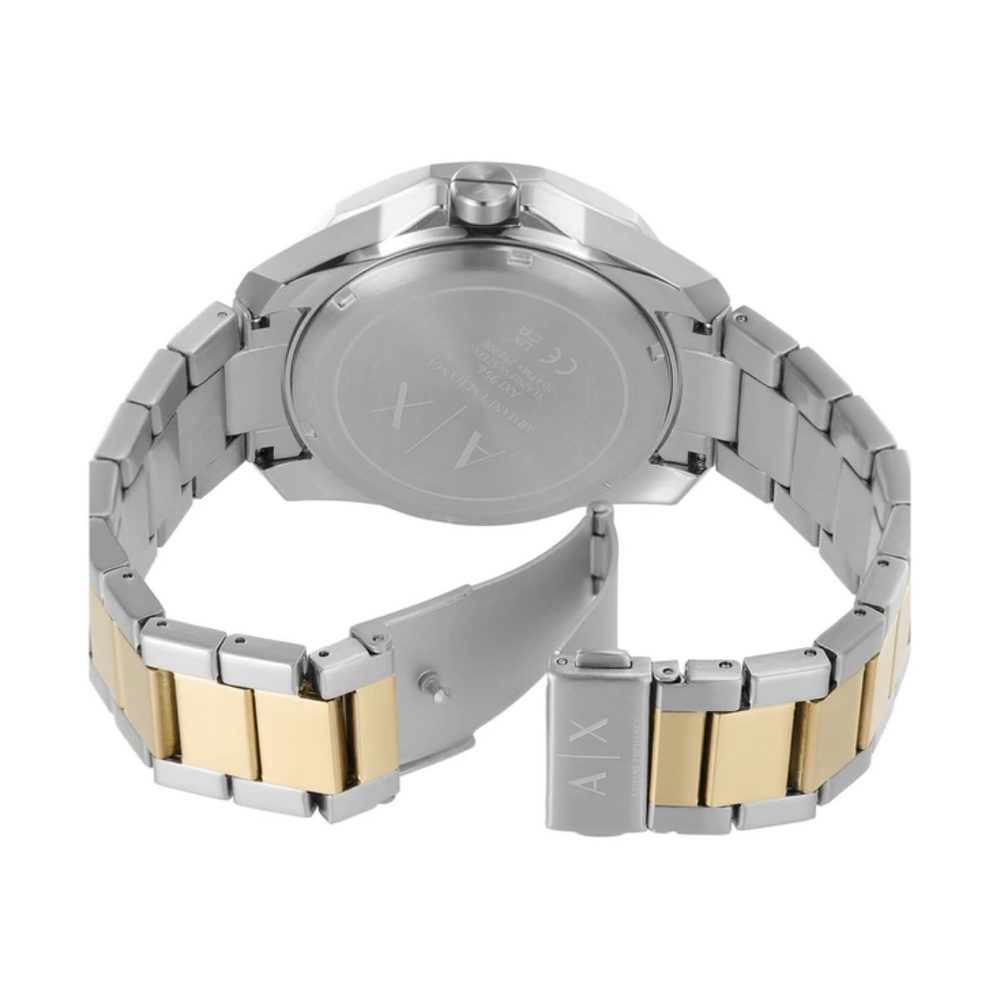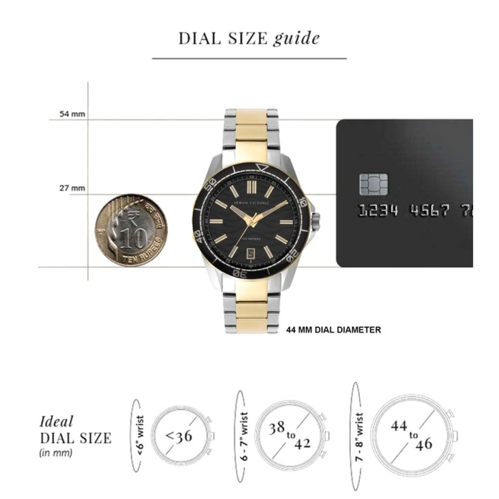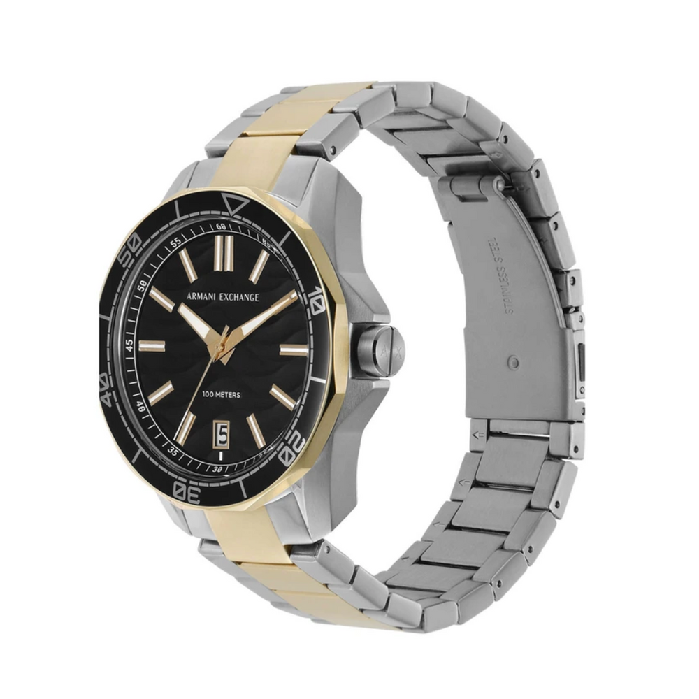 Own this men's analog watch from Armani Exchange and keep yourself updated with the latest trends. The black round dial is protected by a mineral glass. It has a crown for time adjustment. The stainless steel strap comes in a two tone hue that further elevates the look of the timekeeper. Armani Exchange's 44mm watch features a black wave-inspired textured dial, 100 meter water resistance, three-hand date movement and two-tone stainless steel bracelet.