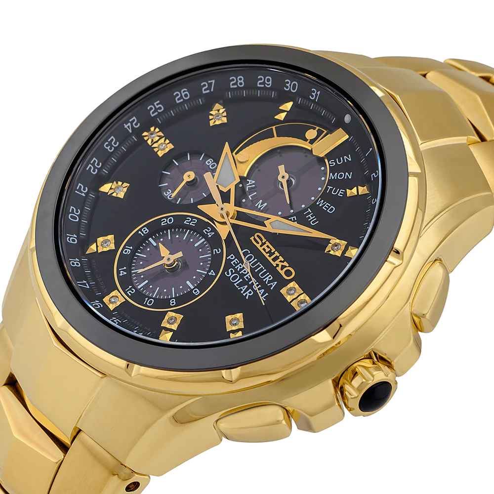 Bold in design and cutting-edge in functionality, this watch from Coutura underscores class in every sense. Powered by the perpetual solar movement, this watch is complete with a black dial, LumiBrite hands and indices, a display that shows the month, date and day and more.