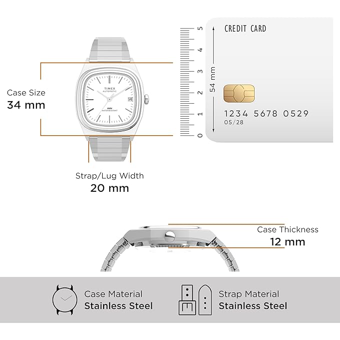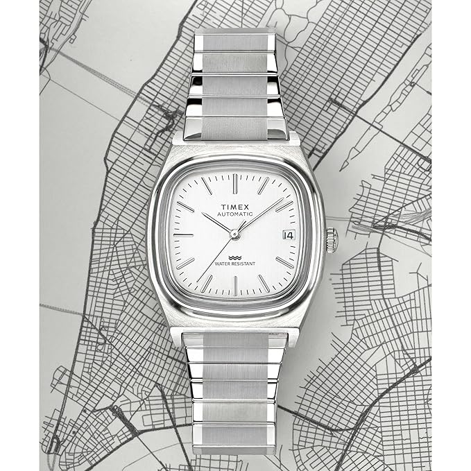 Originally unleashed onto the scene in 1983, the Timex Automatic 1983 E Line Reissue is a classic dress watch distinguished by a rounded square case shape affectionately dubbed the 'TV Dial.’ For this modern-day reissue,We’ve upgraded its construction to stainless-steel and powered it with a 21-jewel Japanese automatic movement that brings the first automatic to our line of reissues. Completing its smooth profile is a brushed and polished stainless-steel expansion band enhanced with our Perfect Fit technology, a vintage-style acrylic crystal, and a discreet date window seamlessly integrated into the clean dial at 3 o’clock.
