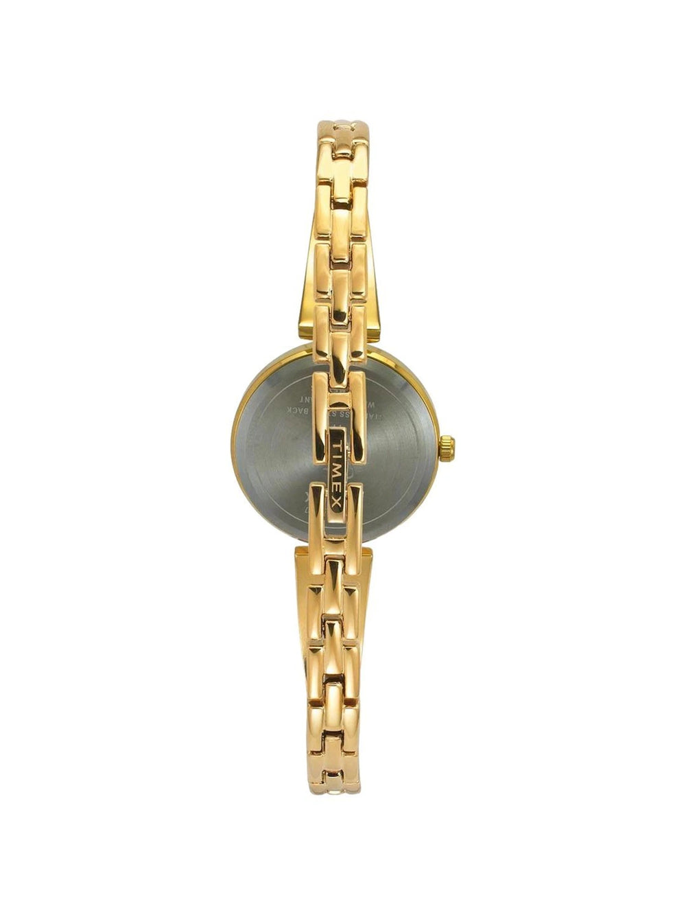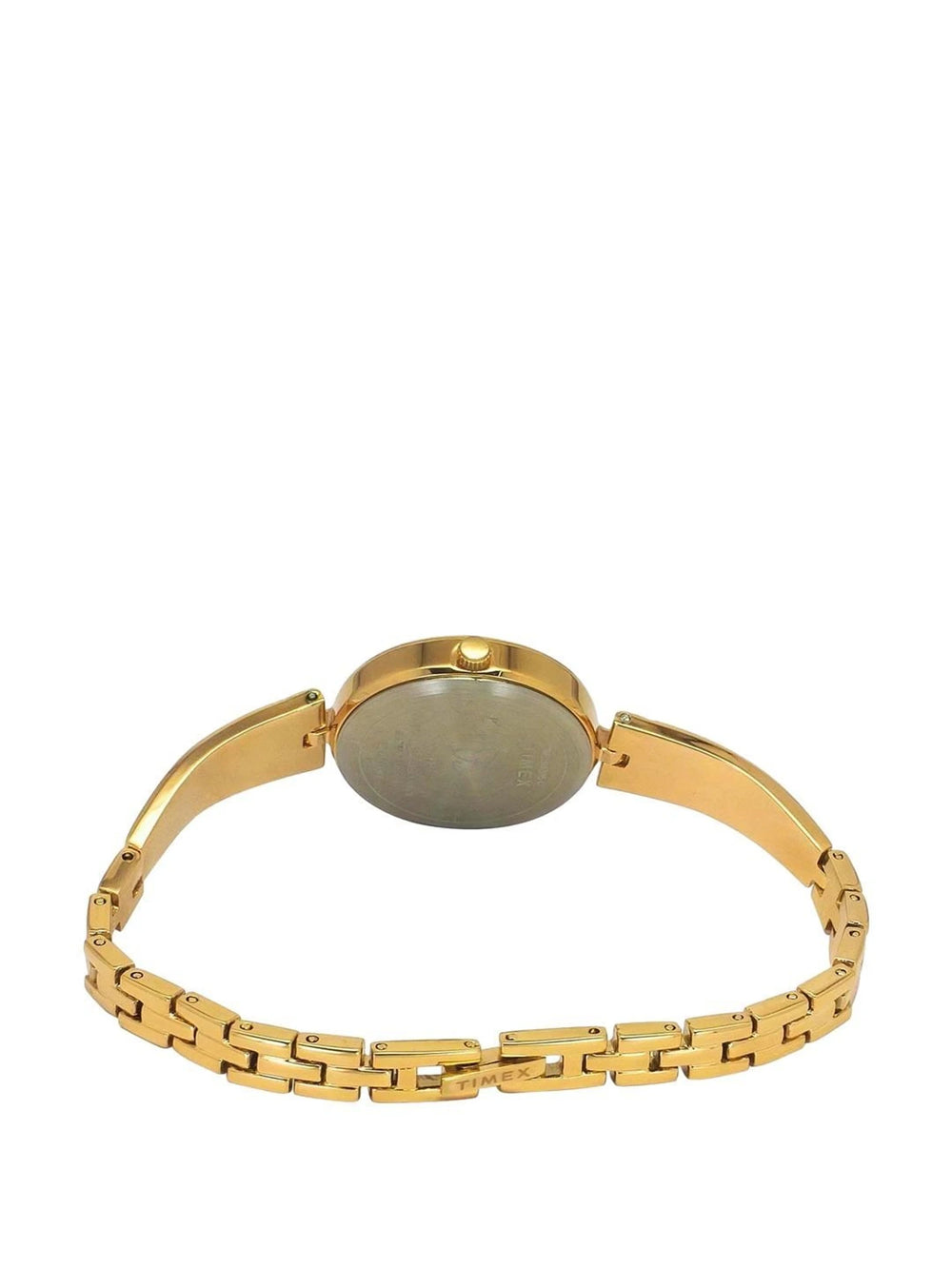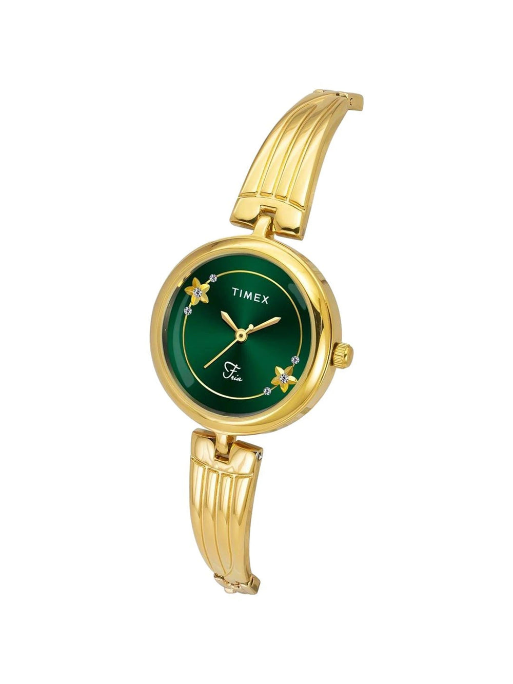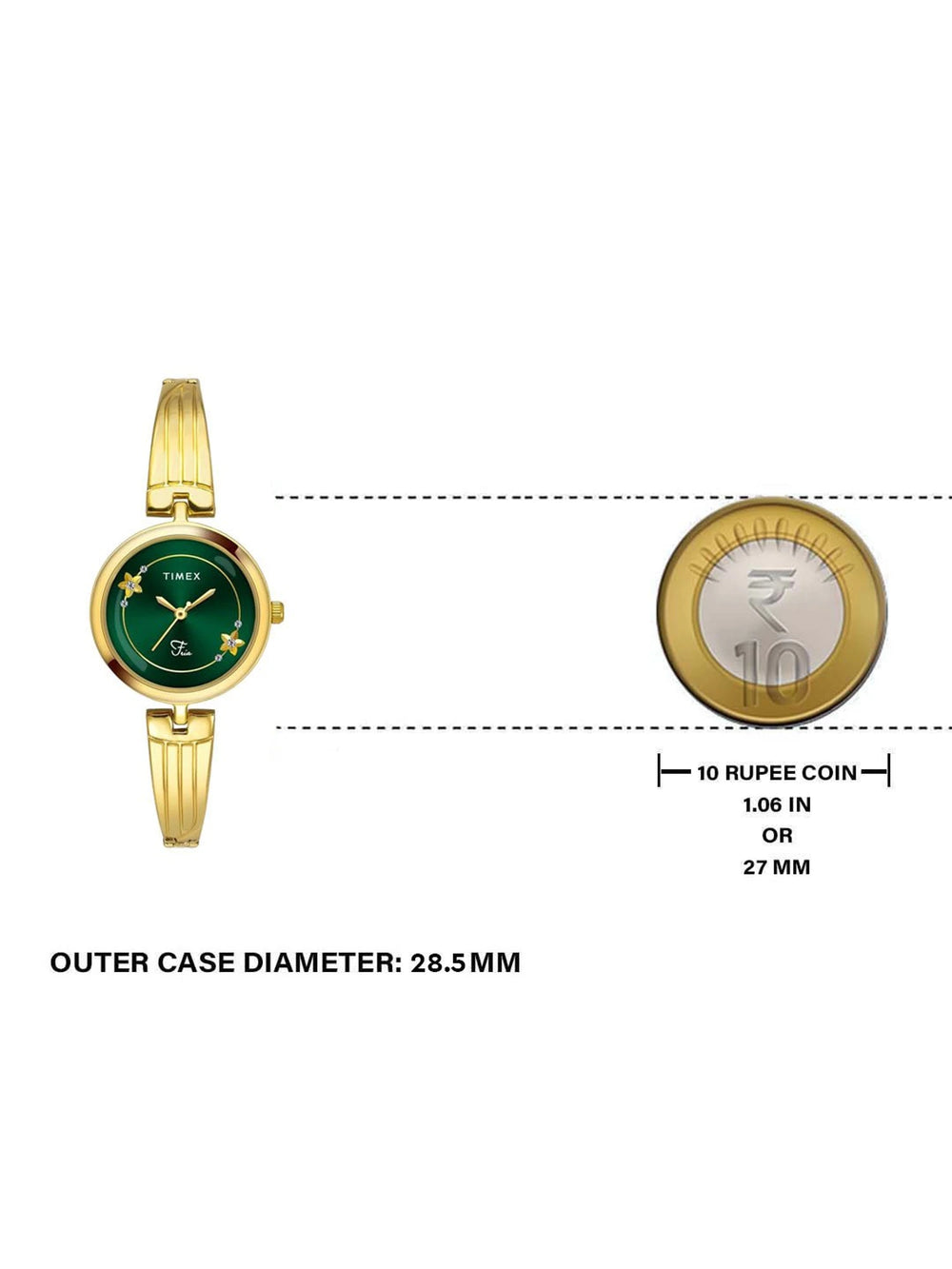 Infuse class to your OCCASION attire with this women's analog watch from Timex. Secured by a mineral glass, the green round dial is nestled in a 28.5 mm case. It exhibits plain three hands. The brass strap exudes a gold hue that accentuates the look of the watch. Moreover, it is equipped with a jewellery clasp to ensure a secure fit on the wrist.