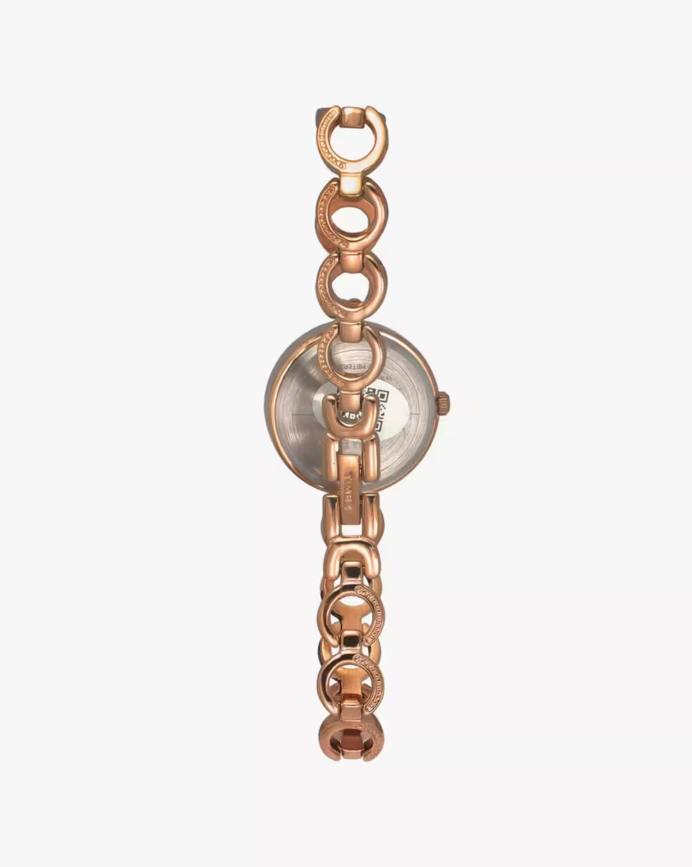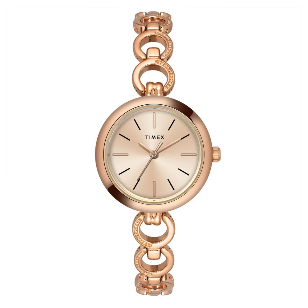 An apt inclusion to keep yourself updated, this Women's's Analog watch from the Fashion collection by Timex is sure to elevate your look. Protected by a mineral glass. Powered by Timex Intelligent Quartz Technology. Classics Collection. Analog Display. Rose Gold Dial Round Shape Watch. Use a clean soft dry cloth for wipe your watch when needed.