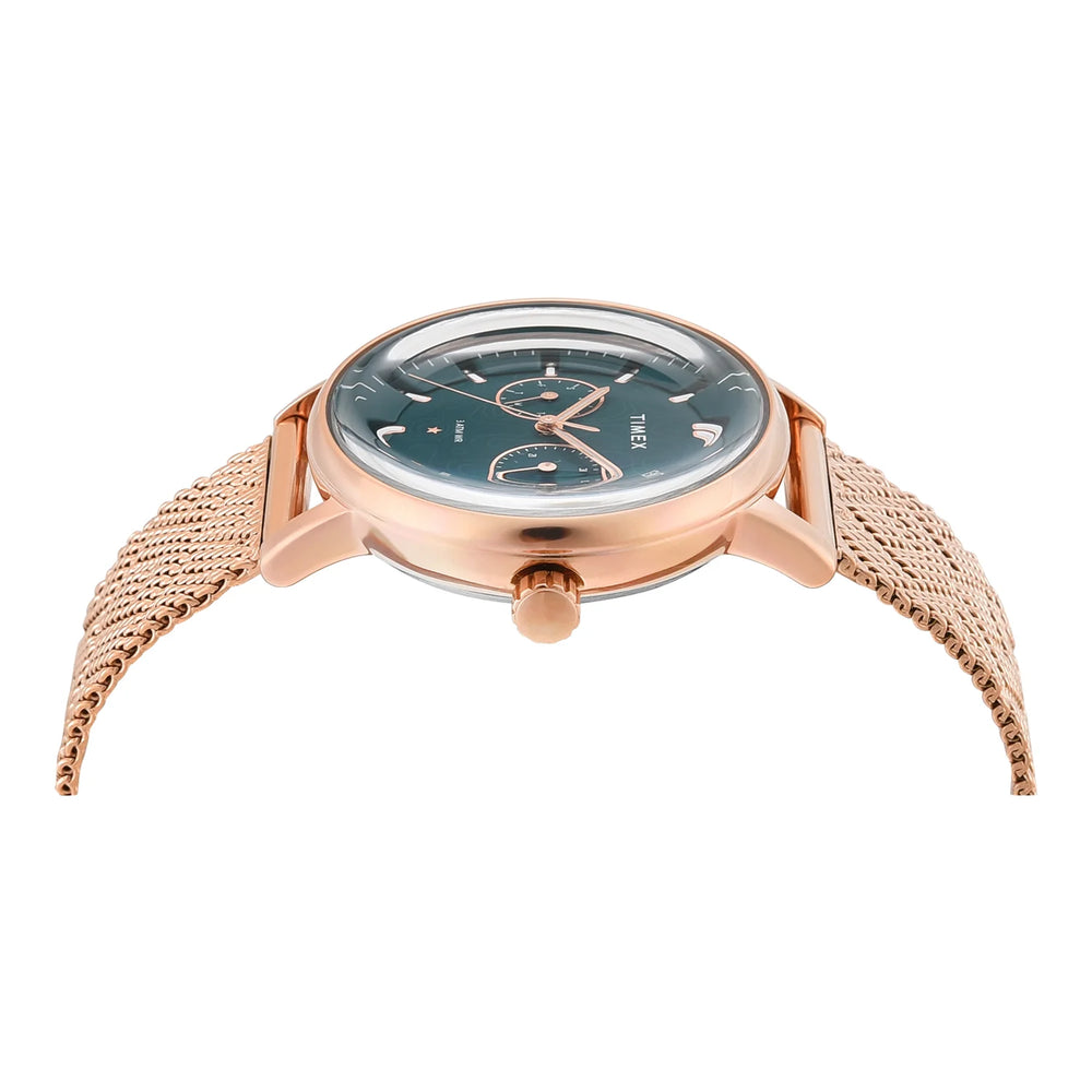 The Timex TWEL20302 Women's Watch offers a chic, layered look with its cosmic-inspired Emerald Green dial, housed in a rose RoseGold-tone case and paired with a vibrant RoseGold Mesh Bracelet . This stylish timepiece combines elegance with a bold twist, making it a perfect accessory for the fashion-forward woman.