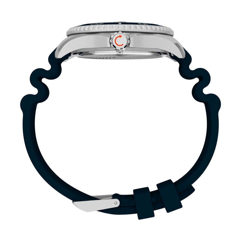 Merging resilience and elegance with crucial functions for underwater pursuits, our Deepwater Meridian 200 is expertly built to venture deeper. A substantial 44mm stainless-steel case, fortified with a screw-down crown and screw-on caseback, effectively keeps water out and provides 200m of water resistance. This watch is powered by a reliable quartz movement, and we’ve equipped it with a sapphire crystal with anti-reflective coating, a sturdy crown protector, a magnified date window, a unidirectional ratcheting top ring, and Super-Luminova® hands and hour markers providing the luminosity you rely on as you venture below. A unique wave pattern brings dimension to the blue dial, while a perforated blue synthetic rubber strap ensures durability, comfort, and style both in and out of the water