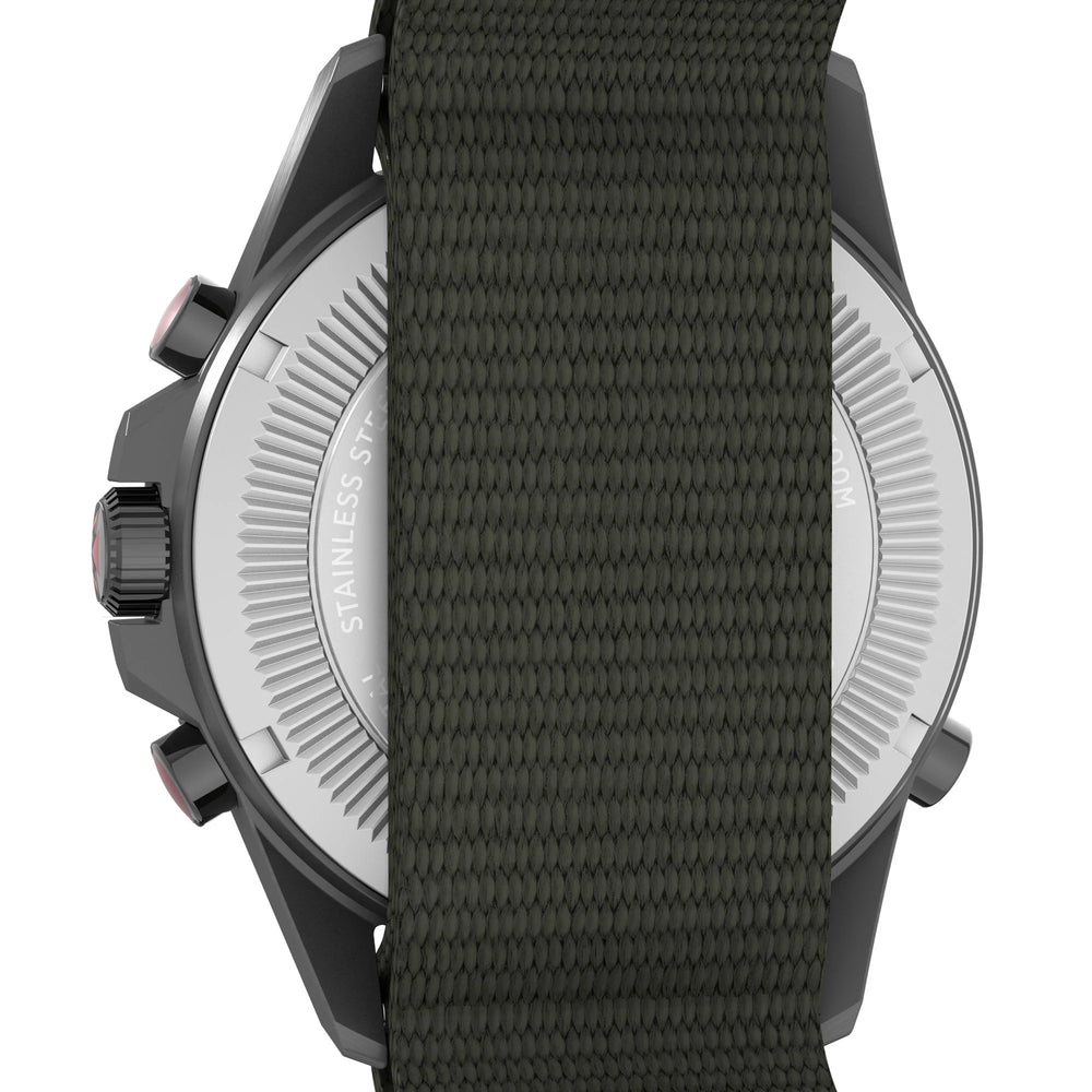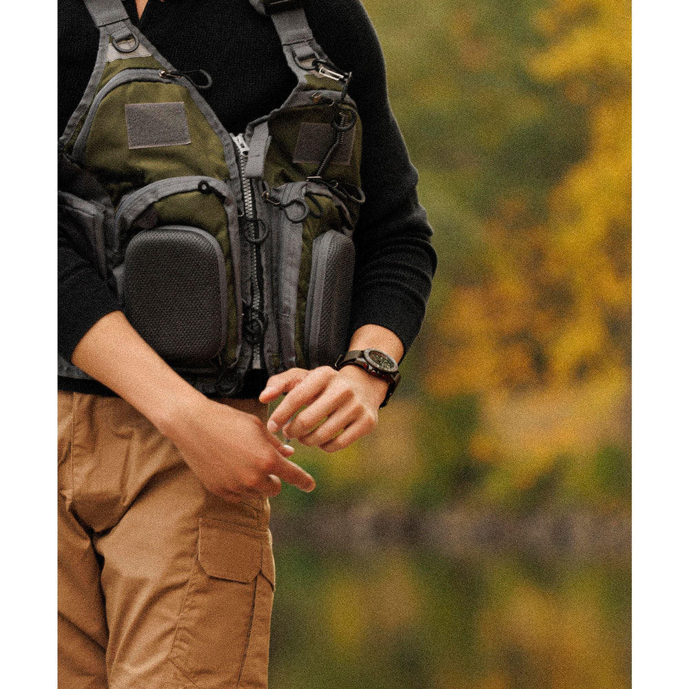 With multiple functions including a tide tracker, temperature sensor that can read the air or water temperature, and analog compass display all driven by a dedicated fourth hand, our Tide-Temp-Compass is the ultimate accessory for the tech-savvy professional with a love for adventure. We've updated it with a 43mm recycled 316L stainless-steel case in a brushed gunmetal finish that’s resistant to rust and corrosion, a double-layered recycled slip-thru fabric strap with a classic compass symbol, and a green-grey dial housed under a sapphire crystal with anti-reflective coating. Other details include luminescent hands and hour markers for enhanced visibility in lowlight conditions, a convenient date window at the 6 o’clock mark, a sturdy crown protector, red detailing on the pushers, and 100m of water resistance.