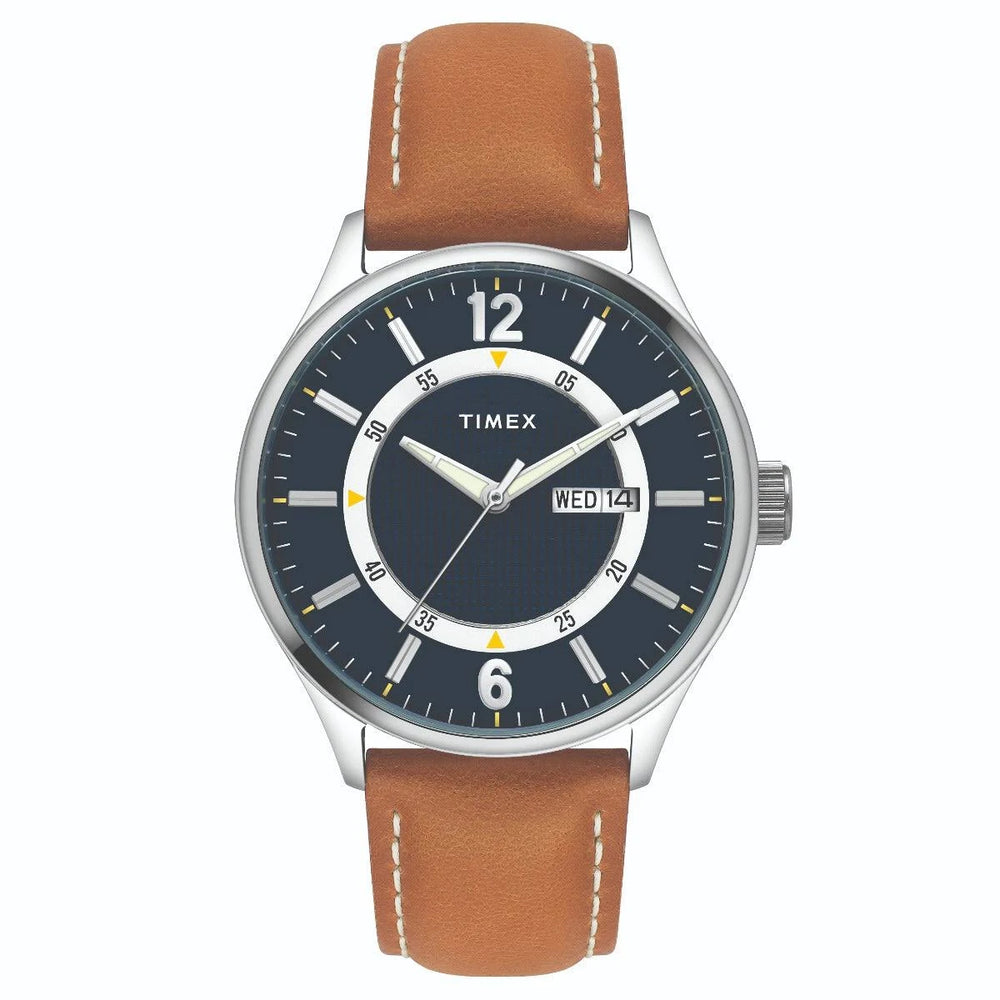 All satinless steel bold watch with textured layered blue dial with day date feature and lens crystal comes with a rich tan leather strap