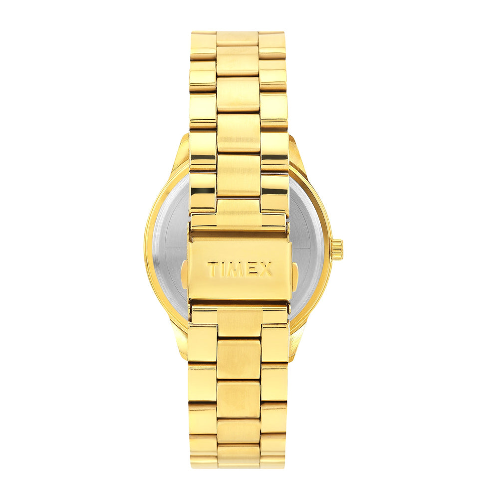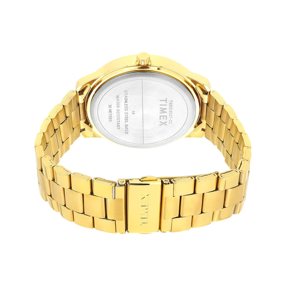 The Timex TWEG18527 men's watch features a bold full Roman green dial with a generous 45 mm diameter, making a striking statement on the wrist. The watch is housed in a durable stainless steel case, ensuring both longevity and style. A comfortable Golden Stainless Steel strap complements the design, making it suitable for both casual and formal wear. Powered by reliable quartz movement, the TWEG18527 is perfect for those who appreciate a modern timepiece that combines functionality with an eye-catching look