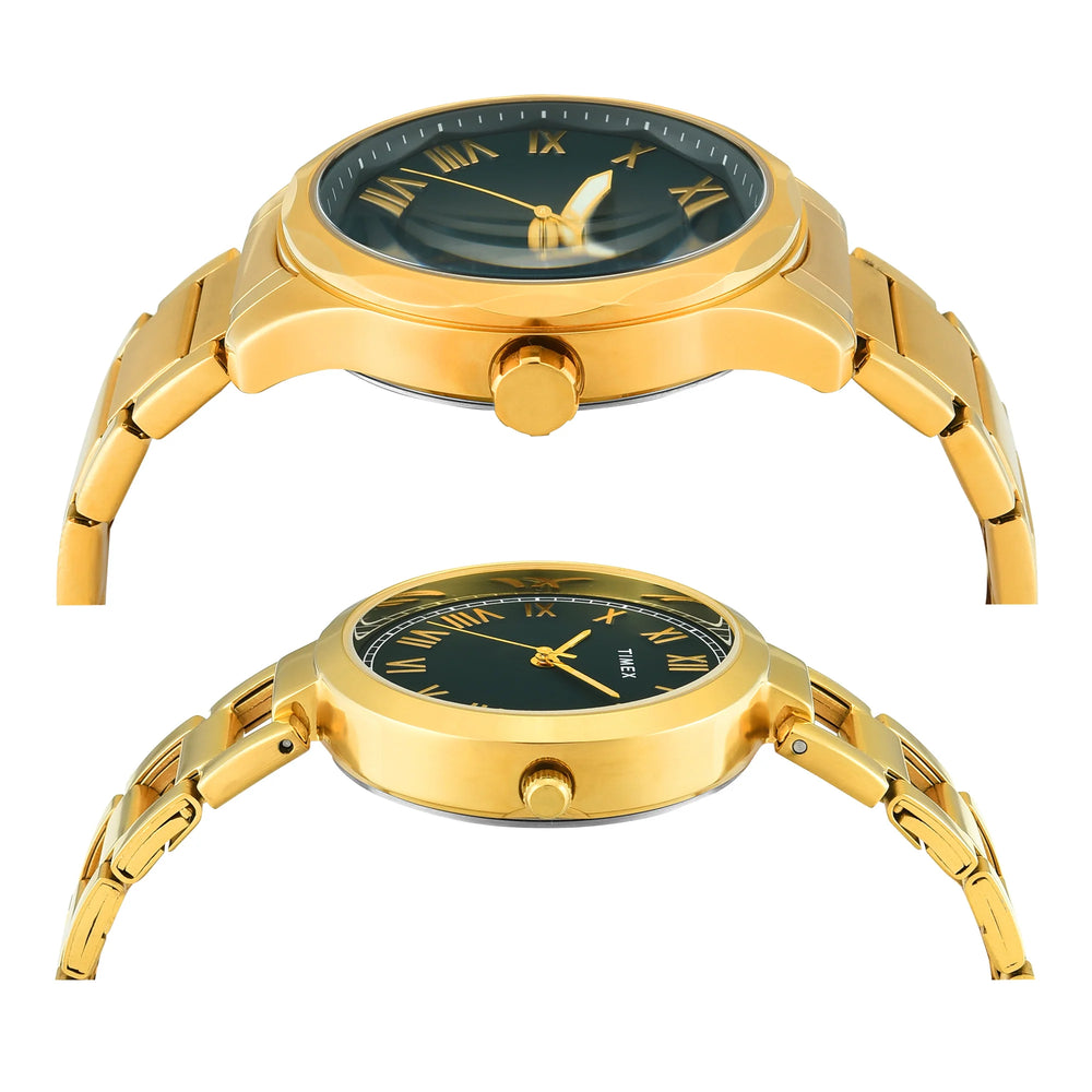 The Timex TW00PR339 Couple watch features a sophisticated full Roman green dial that exudes classic elegance. Encased in a durable stainless steel case and complemented by a stylish Stainless Steel strap, this timepiece is designed for both comfort and versatility. Powered by reliable quartz movement, it’s an ideal choice for those who appreciate a timeless look with a modern twist, making it suitable for any occasion
