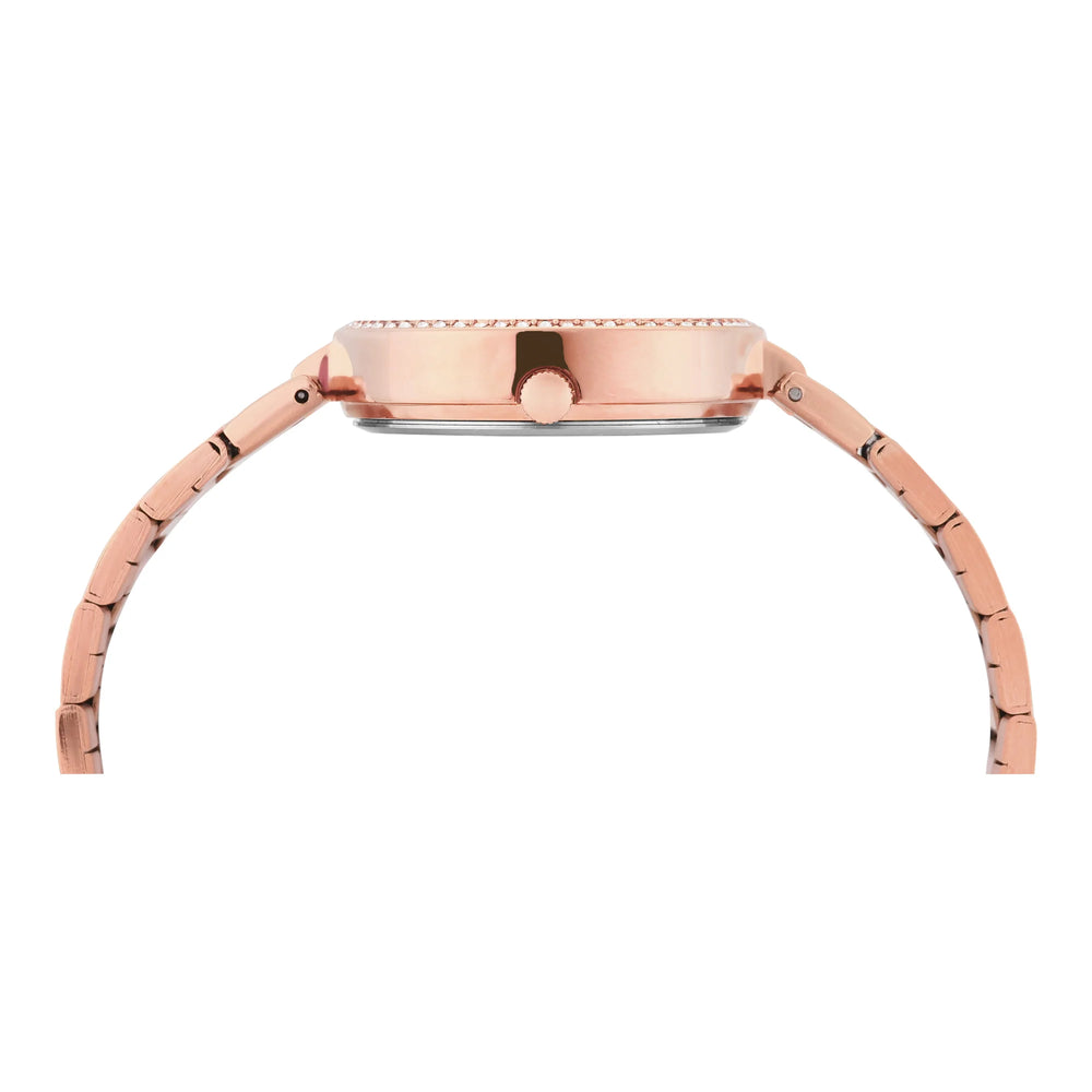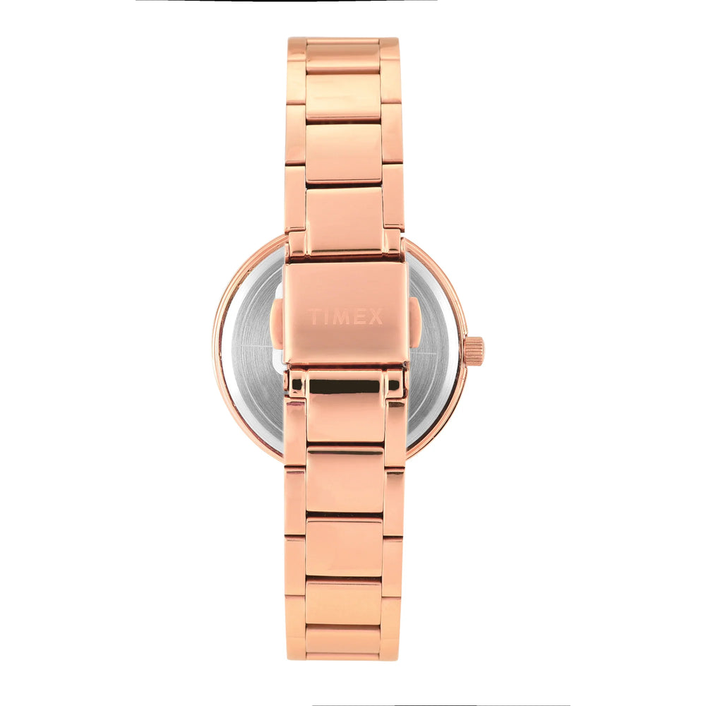 The Timex Glitterati Pink Dial with Roman Numbers Women's Watch TWEL18707 offers a chic and elegant look with its stunning dark dial and Roman numeral markers. The Rose Gold stainless steel case and bracelet add a touch of sophistication, making it perfect for both casual and formal occasions. With its reliable quartz movement and classic design, this watch is a stylish addition to any wardrobe
