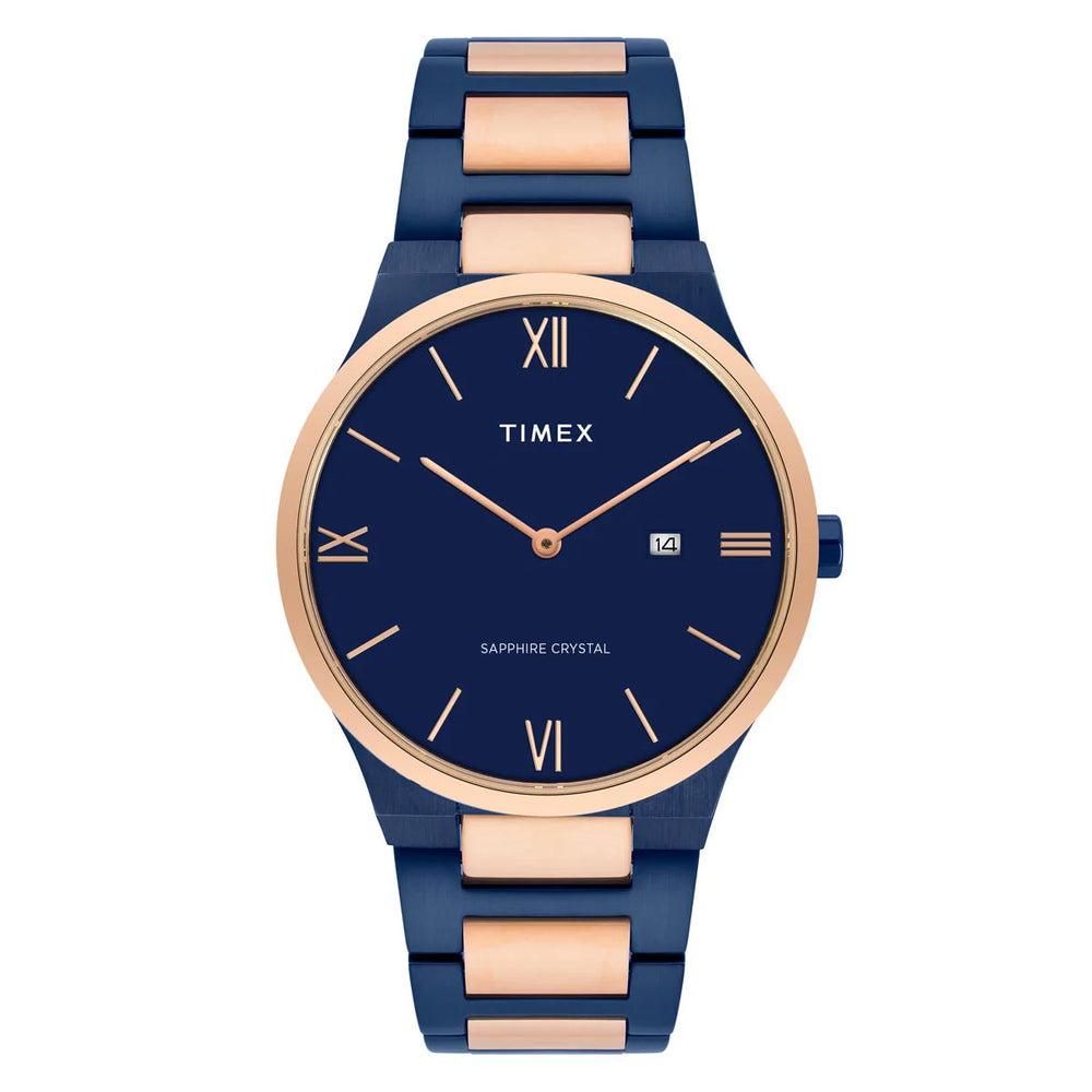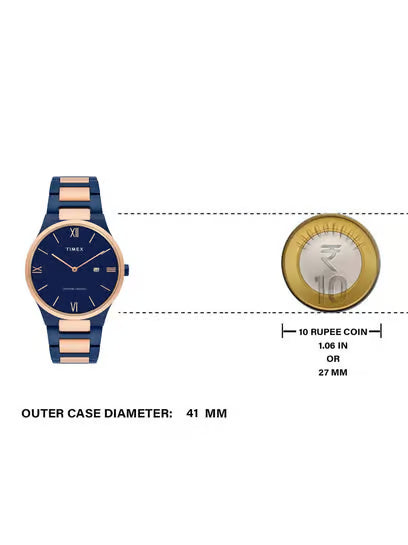 The Timex TWEG23607 men's watch showcases a sleek, glossy blue dial with a polished stainless steel bracelet. Perfect for any occasion, this stylish timepiece combines modern elegance with Timex’s reliable craftsmanship, making it a standout addition to any wardrobe