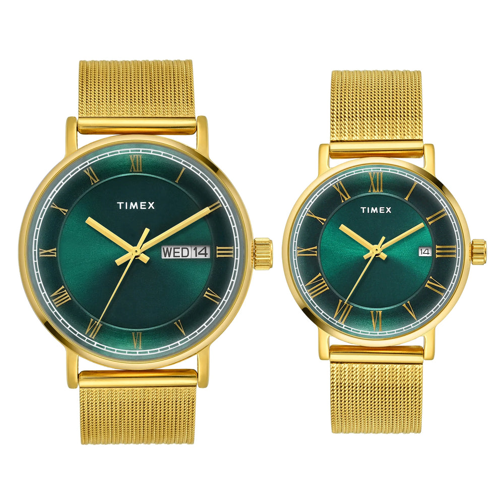 Experience timeless craftsmanship with the TIMEX Watch for Pair Analog, a true classic among water resistant watches for man Analog. Designed with a bold 43.00 x 36.00mm Green dial and a stylish Gold Stainless Steel this Pair's watches model combines modern edge with vintage charm. Built for everyday wear, its Brass case ensures durability, while the 30 m water resistance makes it suitable for daily splashes and unexpected weather. The Analog watch for man runs on reliable Quartz movement, offering precise timekeeping that suits both casual outings and formal occasions. This watch for man ideal for those who appreciate a minimalist look in a classic watch for man making it a perfect choice for office, travel, or daily commutes. Whether you're shopping a watch for man, a formal watch for man, or a timeless wrist watch for Pair, this model checks all the right boxes. It also makes a thoughtful gift, combining elegance with practicality.Its Comes With minimal maintenance and a one-year warranty (limited to manufacturing defects).