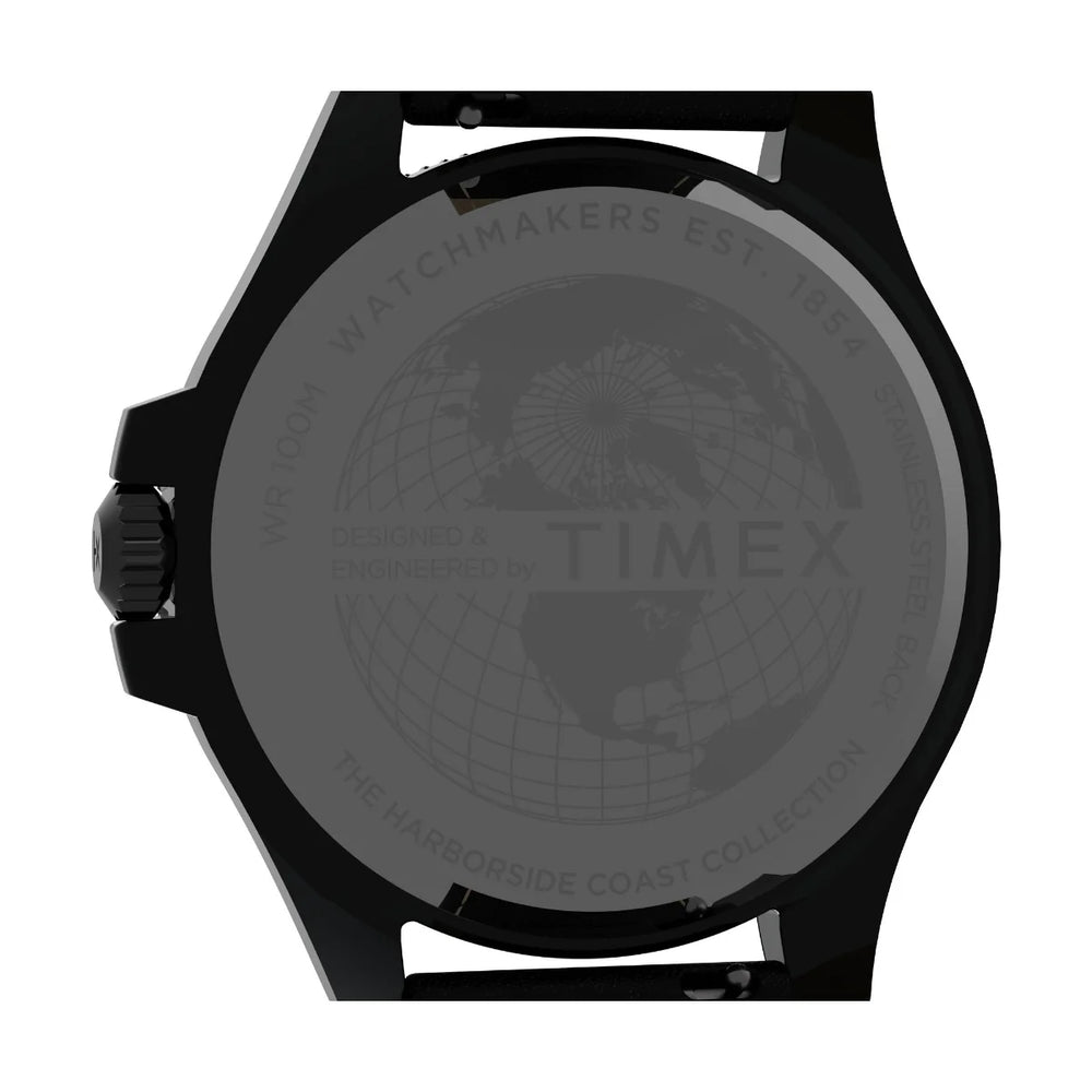 Our Harborside Coast is a refined timepiece designed with nautical influence at the helm. Featuring a 100-meter water resistant 43mm case, this diver-inspired watch stands out on the wrist with a casual, black leather strap. A simple black dial with a touch of metal adds subtle hints of old-world luxury to an otherwise modern, adventure-ready physique. Complete with an anodized aluminum inlay on a rotating bezel, date feature with date magnifier, and luminescent paint on the markers and hands, the Harborside Coast is ready to set sail.