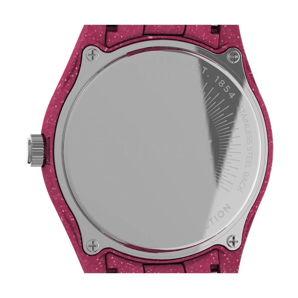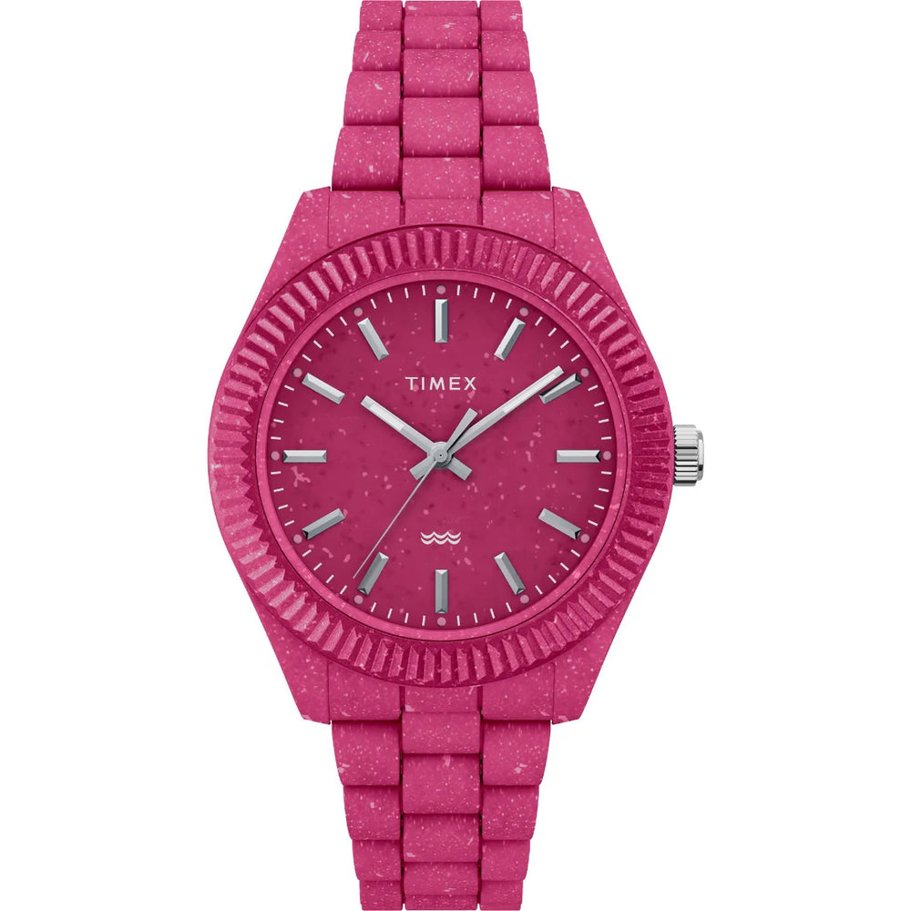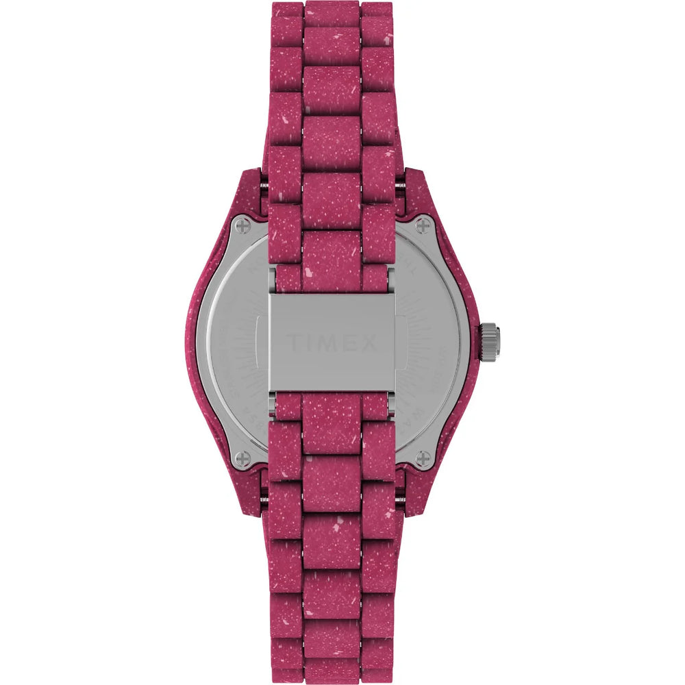 We’ve redesigning our past to take care of our future with the Legacy Ocean collection. Featuring a pink case, bracelet, and dial crafted from upcycled, ocean-bound plastic, this remarkable wristwatch is the first Timex of its kind. Our partnership with #tide™ means its journey from waste to wrist begins with fishermen collecting plastic from the coastlines; the waste is washed and shredded before making its way to Switzerland via carbon-neutral transportation; and finally,it’s repurposed on-site, resulting in a premium, sustainable material. Legacy Ocean’s marine-inspired dial features unique flakes of shredded material, while the classic Legacy construction itself honors our rich legacy in traditional watchmaking. Navigate uncharted waters ahead with all the trusted functionality you’d expect from a Timex: luminescent hands and 30 meters of water resistance—and join us in working toward a cleaner tomorrow.