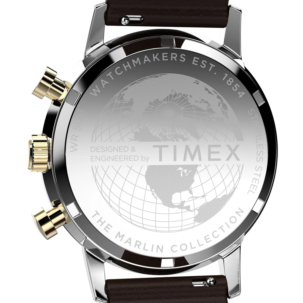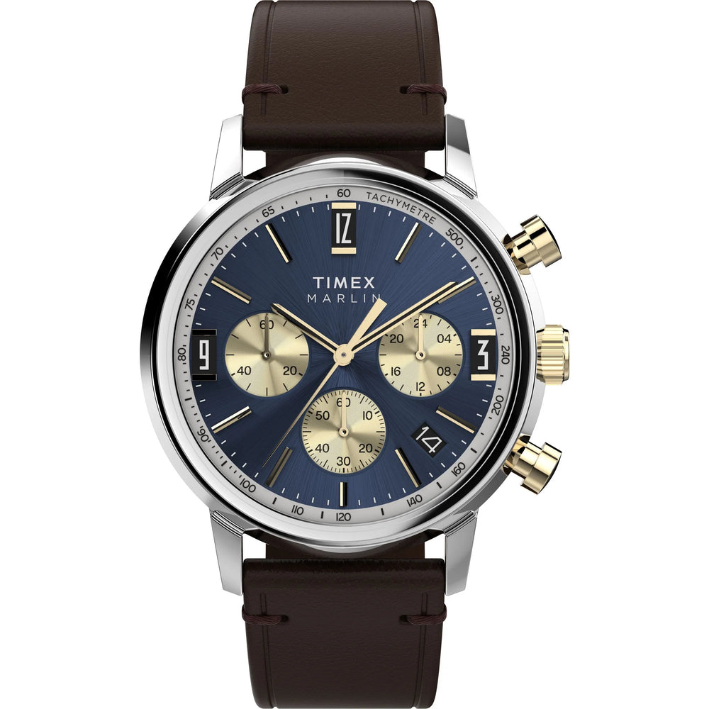 Our Marlin Quartz Chronograph Tachymeter was the first chronograph to join our Marlin line, as well as the first Marlin powered by a quartz movement. Beautifully detailed, it features a tachymeter index along its outer minute track to measure speed, as well as a unique date window placement and gorgeous gold-tone accents on its blue dial. Paired with either an eco-friendly natural leather strap sourced from the Leather Working Group (LWG) with quick-release spring bars. Though its build broke new ground in our watchmaking heritage, this timepiece retains the classic Marlin features with a sturdy 40mm recycled stainless-steel case, domed acrylic crystal, and retro-style applied indices at 3, 9, and 12 o'clock.