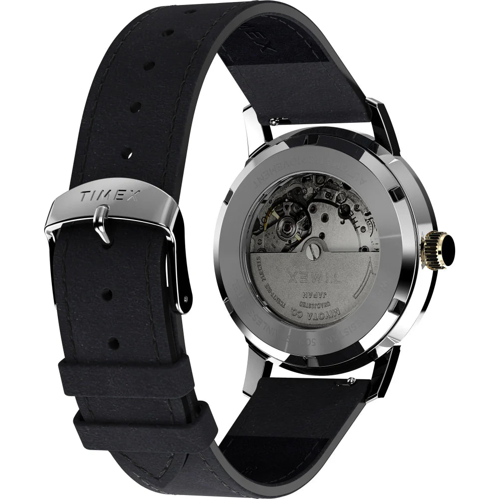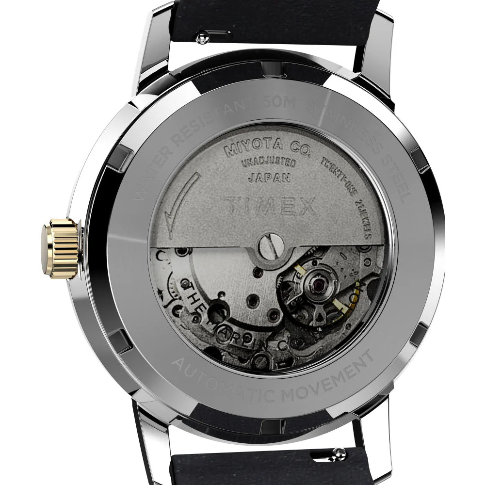 Ticking inside this iteration of our iconic 1960s Marlin? is a tried-and-true 21-jewel Japanese automatic movement, creating a contemporary timepiece that honors our watchmaking history. Powered by your motion as you wear the watch, the movement can store a maximum 40 hours of energy. If motionless for longer than 40 hours, wind the watch using the crown until you feel resistance, set the time, and place it back on your wrist where every motion will supply the energy. True to our original Marlin design, this watch features the iconic domed acrylic crystal and retro-style applied indices, complemented by a sturdy 40mm stainless-steel case with exhibition case back and a black dial. The supple black natural leather strap is sourced from the Leather Working Group? (LWG) and comes with quick-release spring bars.?