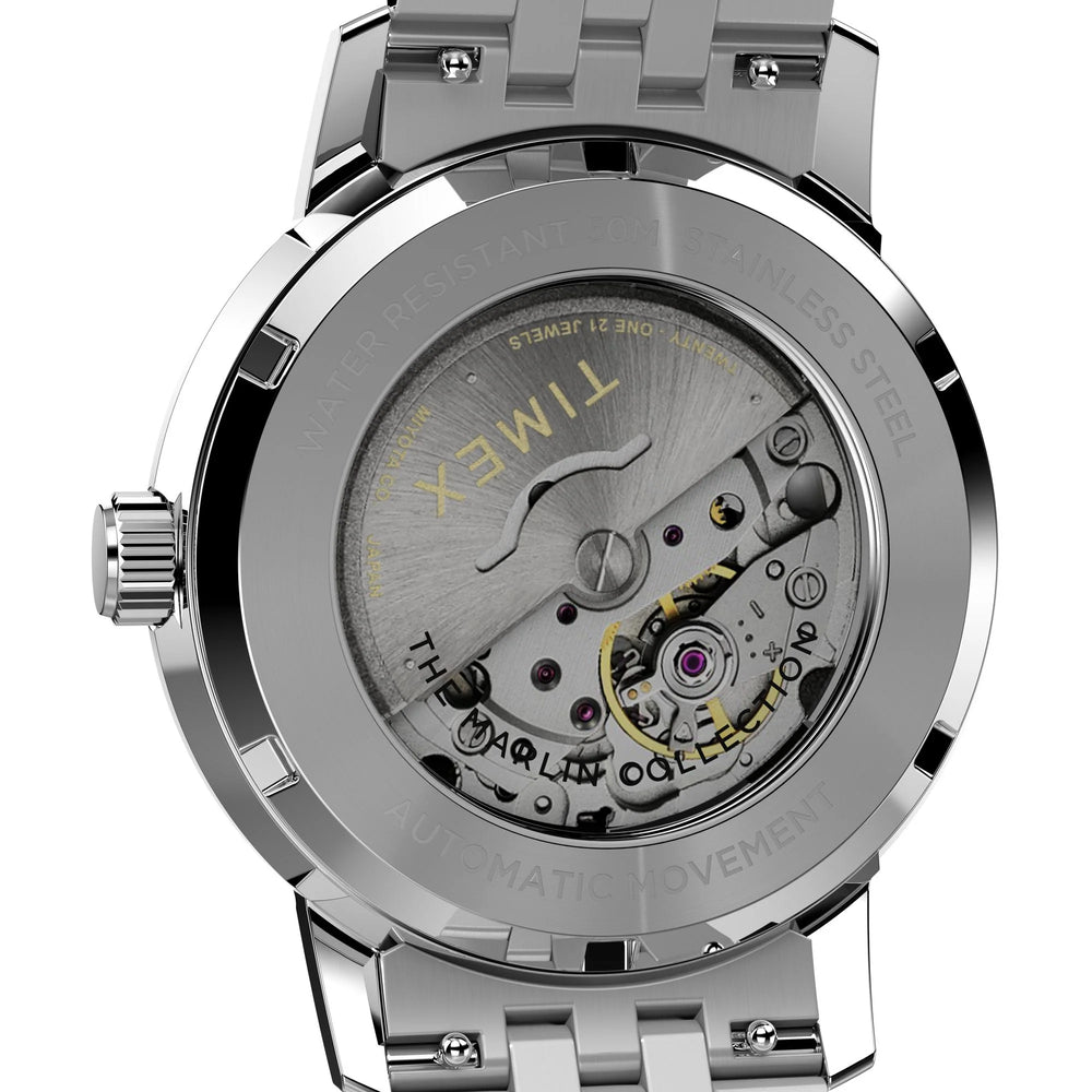 Ticking inside this iteration of our iconic 1960s Marlin is a tried-and-true 21-jewel Japanese automatic movement, creating a contemporary timepiece that honors our watchmaking history. Powered by your motion as you wear the watch, the movement can store a maximum 40 hours of energy. If motionless for longer than 40 hours, wind the watch using the crown until you feel resistance, set the time, and place it back on your wrist where every motion will supply the energy. True to our original Marlin design, this watch features the iconic domed acrylic crystal and retro-style applied indices, complemented by a sturdy 40mm recycled stainless-steel case with exhibition caseback and a deep champagne dial. Paired with the newest option of a recycled stainless-steel bracelet.
