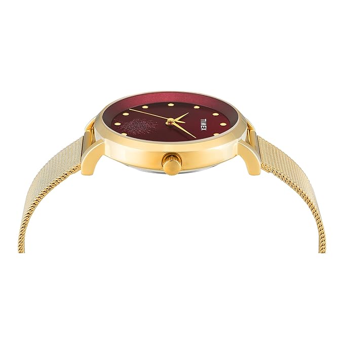 Timex Maroon Dial Women's Watch - TWEL12923 offers a chic and elegant look with its stunning green dial and Roman numeral markers. The silver-tone stainless steel case and bracelet add a touch of sophistication, making it perfect for both casual and formal occasions. With its reliable quartz movement and classic design, this watch is a stylish addition to any wardrobe.