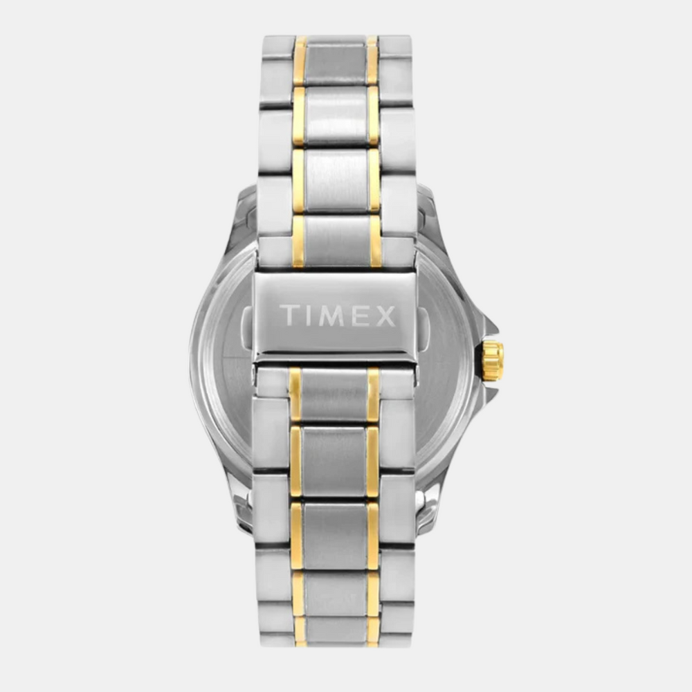 Amaze everyone around you by wearing this men's analog watch from Timex. Encased in a 42 mm case, the green round dial features plain 3-hand functionality with a quartz movement. Genuine Timex watch with stainless steel bracelet comes in a two-tone hue that further elevates the look of the watch. Besides, it has water resistance up to 30m and a push button clasp to ensure a secure fit on your wrists.