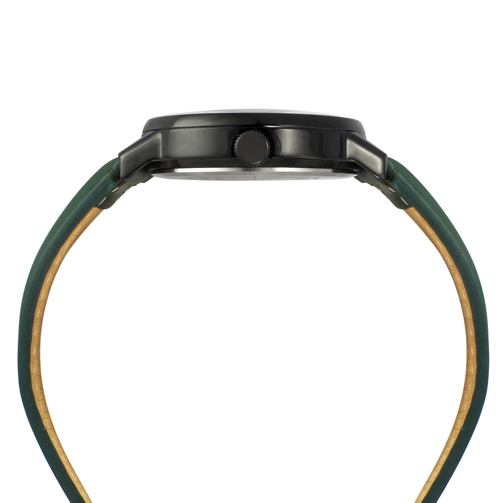 An eye catching black round dial makes this men's analog watch by Timex a great inclusion to your watch collection. Secured by a mineral glass, the dial is housed in a 41 mm case. It exhibits plain three hands. The leather strap vaunts a green hue that enhances the look of the watch. Moreover, it is fitted with a buckle clasp to ensure a secure fit on the wrist.