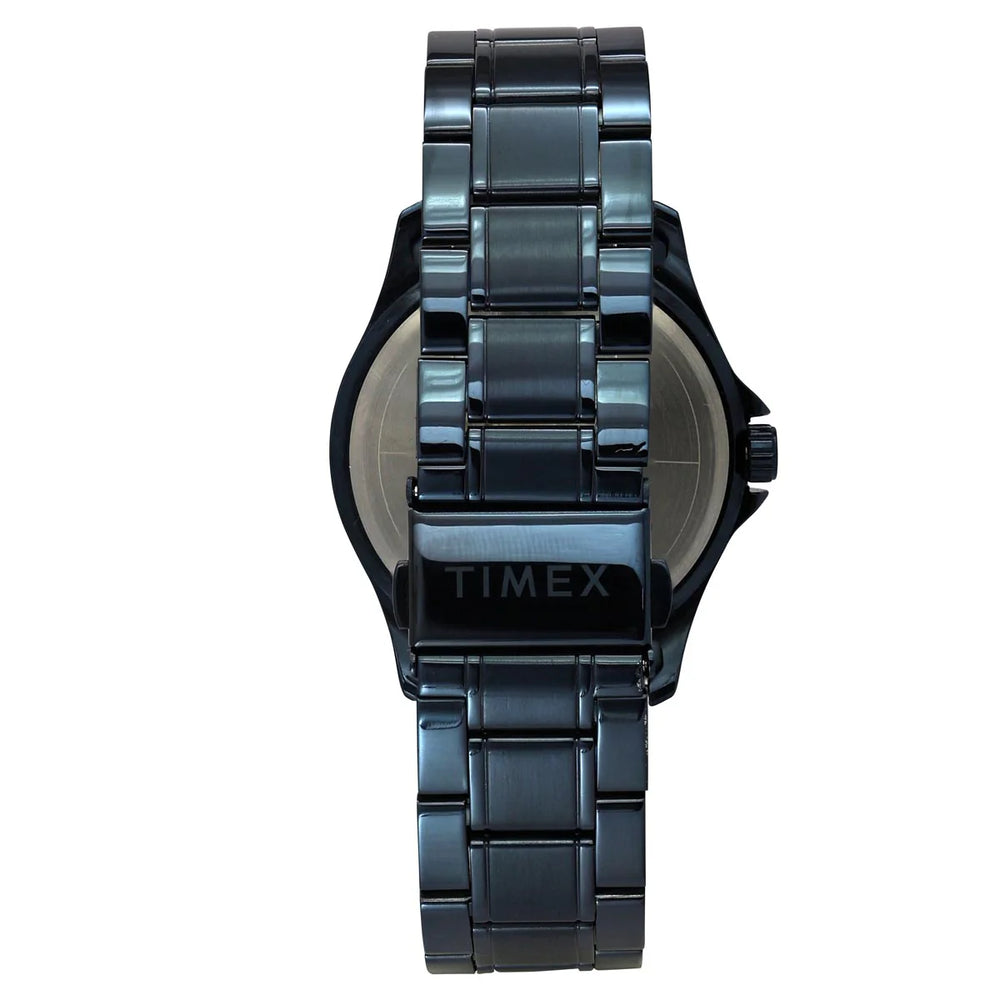 Compel the onlookers to cast a glance of appreciation as you wear this men's analog watch by Timex. Secured by a mineral glass, the blue round dial is functional on a quartz movement. It exhibits plain three hands. The stainless steel strap comes in a blue hue that further elevates the look of the watch. Moreover, it is fitted with a push-button clasp that ensures a secure fit on the wrist.