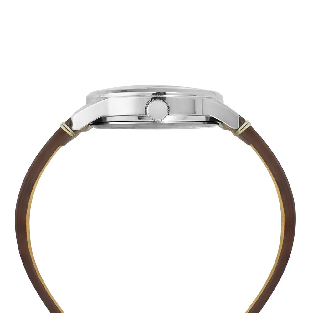 Effortlessly combining style and functionality, this men's analog watch by Timex will be a perfect pick. The leather strap showcases a brown hue that uplifts the look of the watch. Safeguarded by a mineral glass and functional on a quartz movement, the blue round dial is encompassed in a 41 mm case. It features plain three hands. Furthermore, it is complemented with a buckle clasp that ensures a secure fit on the wrist.