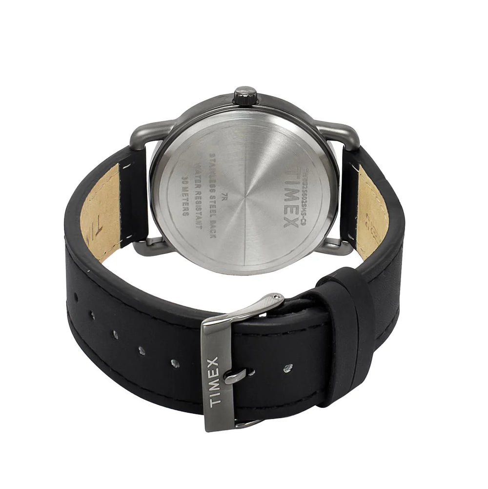Give your wrist a classy look with this men's analog watch by Timex. Encased in a 43 mm case, the green round dial is protected by a mineral glass. It features plain three hands. The leather strap showcases a black hue that uplifts the look of the watch. Besides, it is completed with a buckle clasp to ensure a secure fit on the wrist.