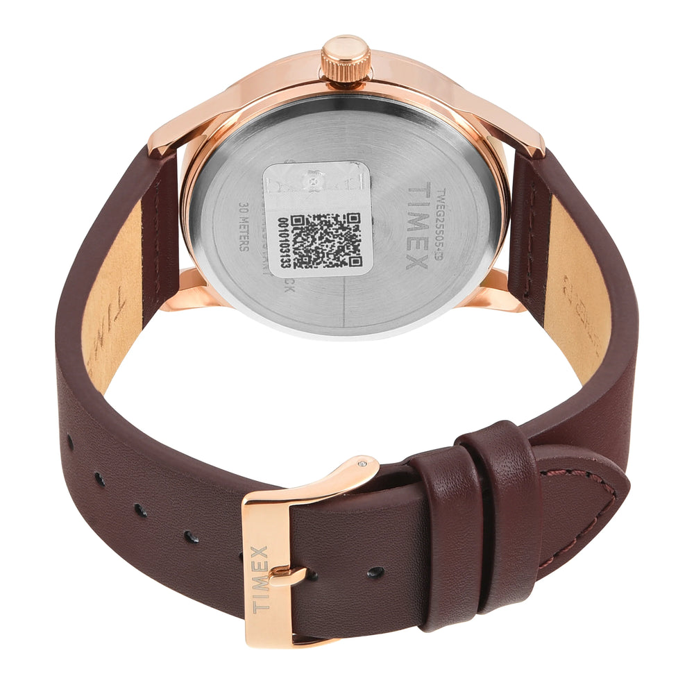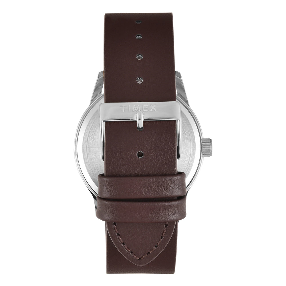 Showcasing a modish design, this men's analog watch by Timex is highly versatile that can be worn with an array of outfits. Protected by a mineral glass, the silver round dial is housed in a 41 mm case. It vaunts plain two hands. The leather strap flaunts a brown hue that accentuates the look of the watch. Moreover, it is fitted with a buckle clasp to ensure a secure fit on the wrist.
