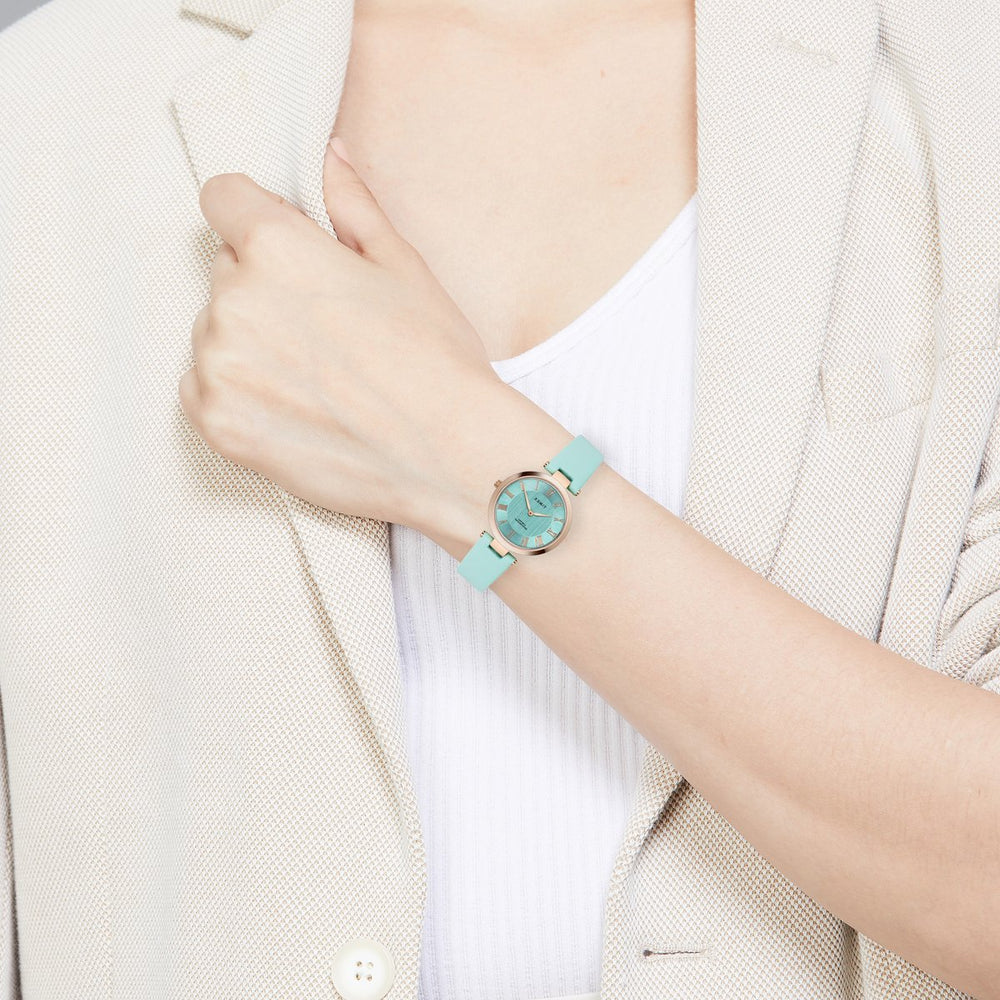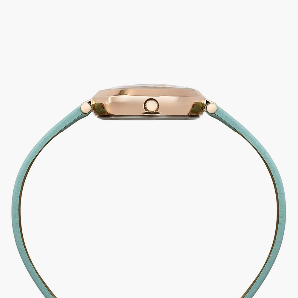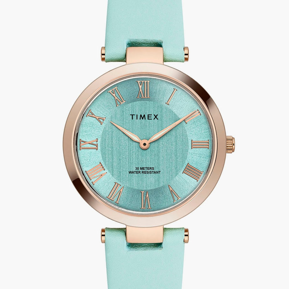 The Timex Roman Silver Dial Analog Women's Watch (TWEL192010) features a sleek Tiffany Blue dial with a polished brass case and a stylish blue leather strap. Its elegant design, reliable quartz movement, and 30m water resistance make it a perfect blend of sophistication and practicality for everyday wear.