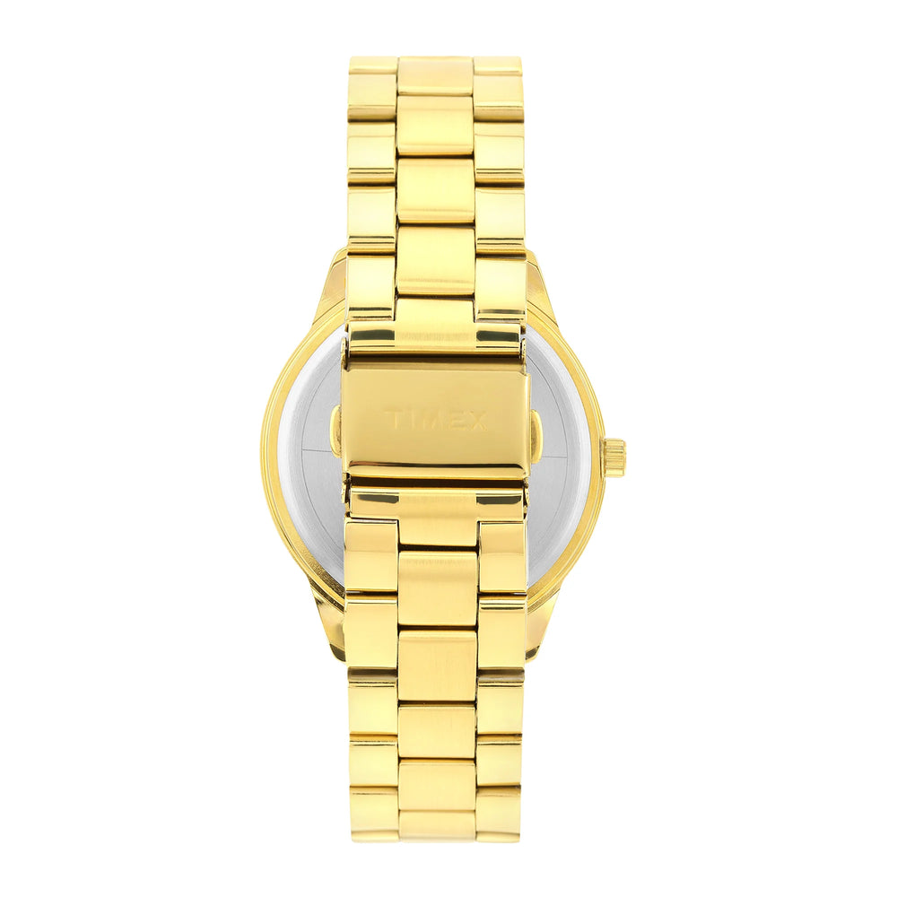 The Timex TWEG18522 men's watch features a bold round green dial with a 45mm diameter, making a striking statement on the wrist. Encased in durable stainless steel, this timepiece combines modern aesthetics with robust functionality. The comfortable Golden Stainless Steel strap ensures a secure fit, making it perfect for everyday wear or special occasions. Powered by reliable quartz movement, the TWEG18522 is ideal for those who appreciate a blend of style and precision in their accessories