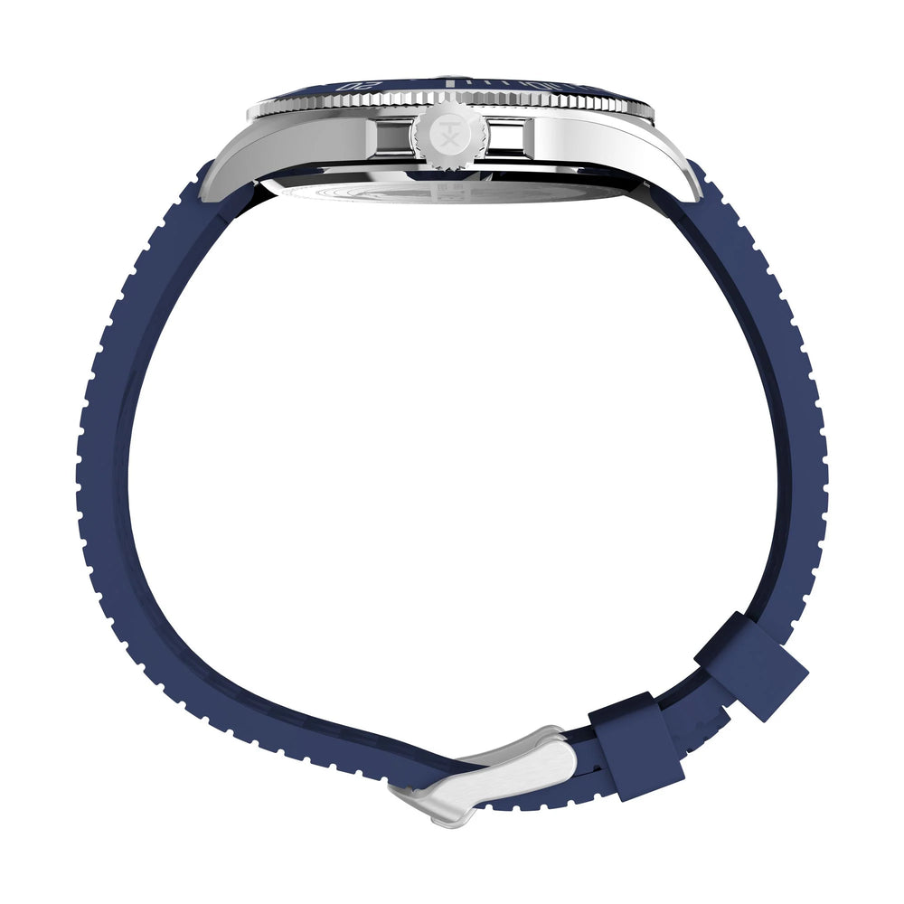 This diver-inspired timepiece is both polished and rugged, built with a sturdy 44mm brushed and polished case equipped with a unidirectional rotating top ring. It stands out on the wrist with a blue sunray dial and a blue textured synthetic rubber strap that’s perforated for enhanced breathability in and out of the water. Powering it is a reliable quartz movement, and we’ve equipped it with 100m of water resistance, a sturdy crown protector, a magnified date window, and luminant hands and hour markers for better visibility in lowlight conditions.
