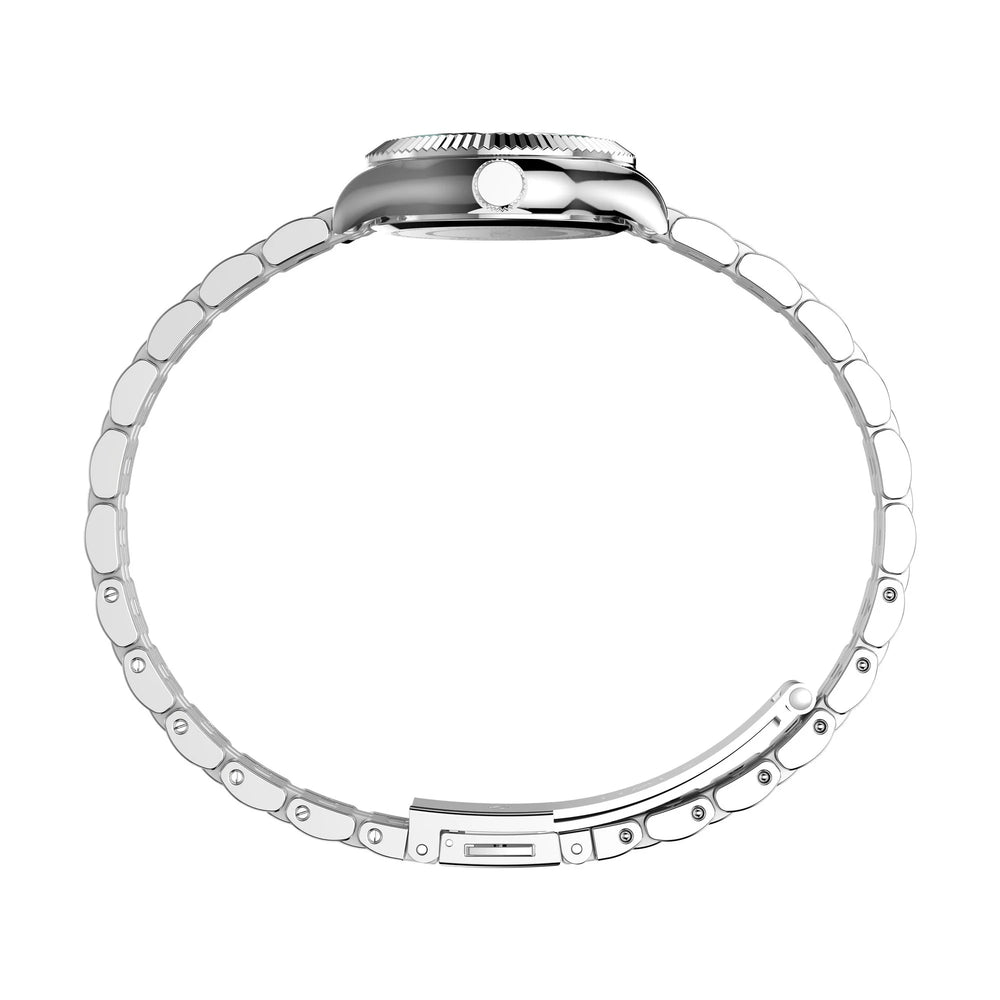Following recent trends in petite watches, we’ve refined our Women’s Timex Legacy with a smaller polished 25mm case. The sunray dial appears in a delicate shade of aquamarine, highlighted by applied indices and perfectly encircled by an elegantly fluted bezel. We’ve paired this stylish mini with a shining brushed and polished silver-tone stainless-steel bracelet.